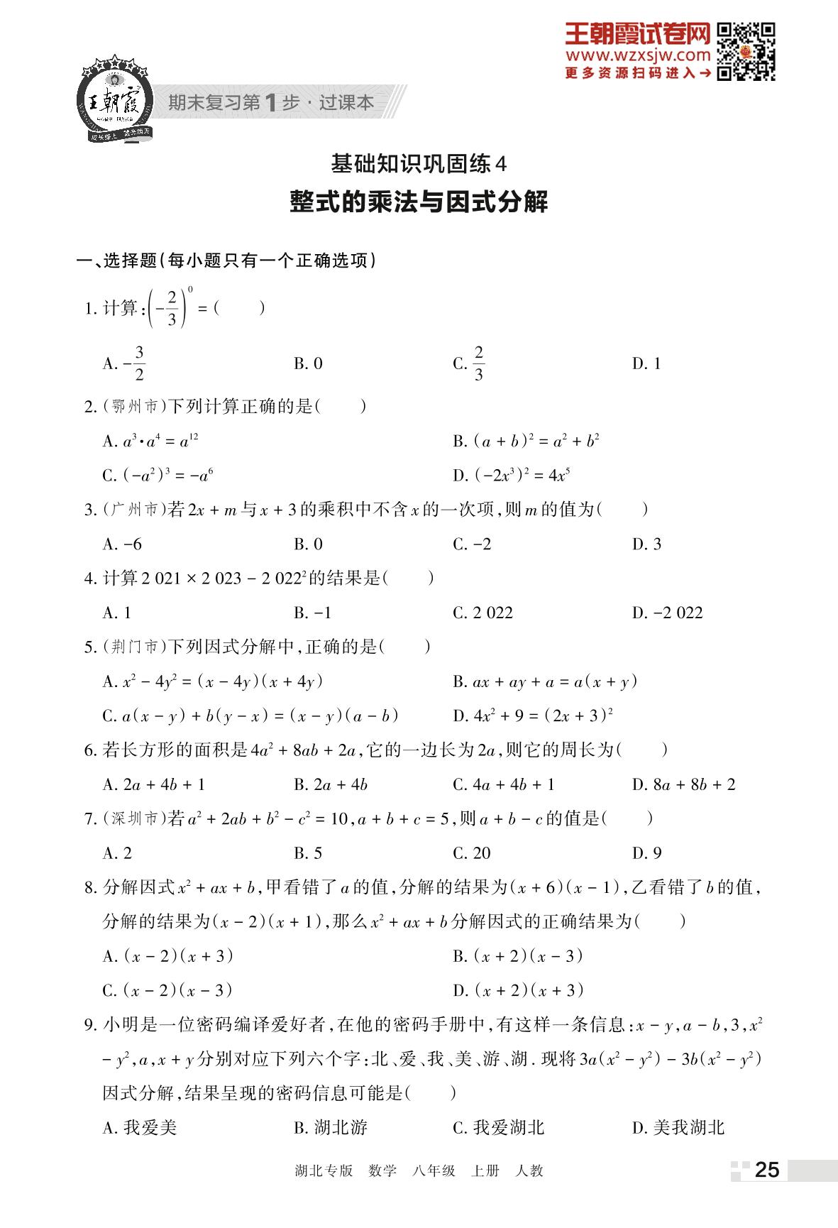王朝霞期末过课本——基础知识巩固练4 整式的乘法与因式分解八年级上册数学(人教版)_R221125150027060