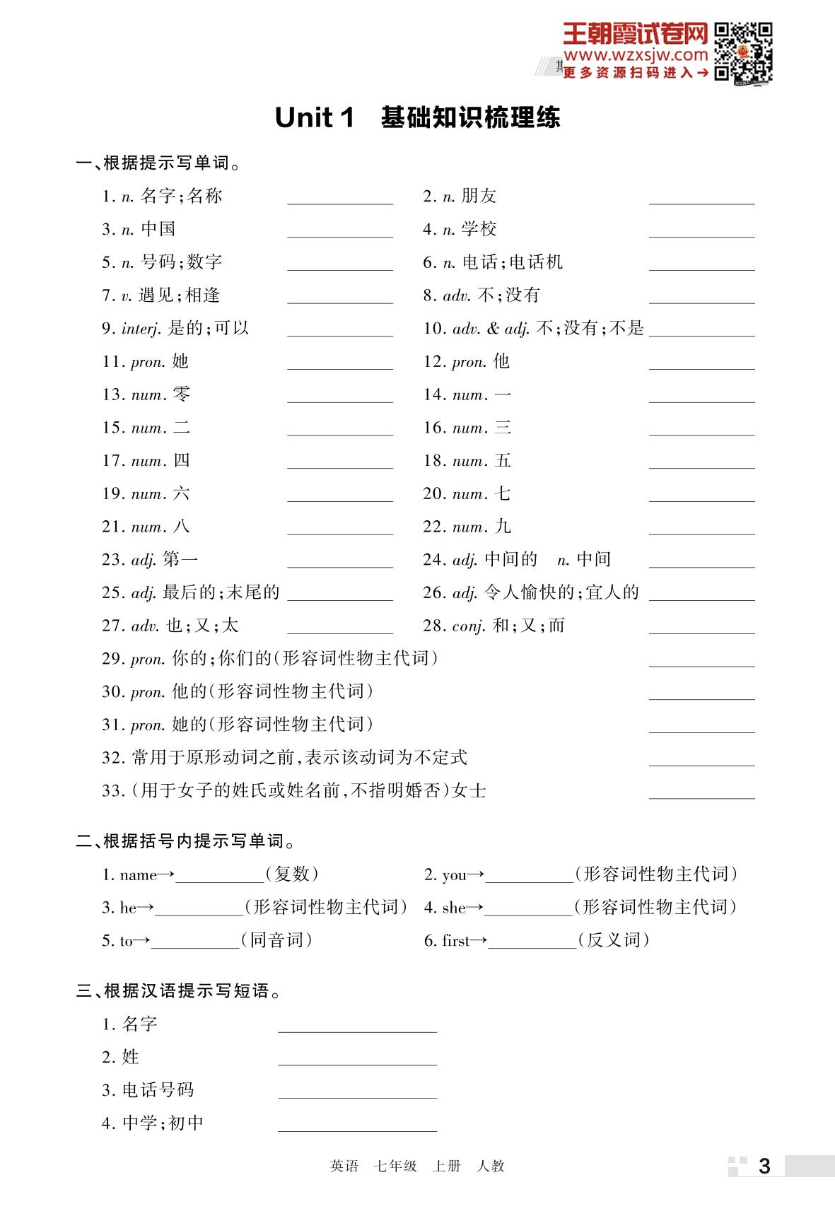 王朝霞期末过课本——Unit 1 基础知识梳理练七年级上册英语(人教版)_R221125151111007