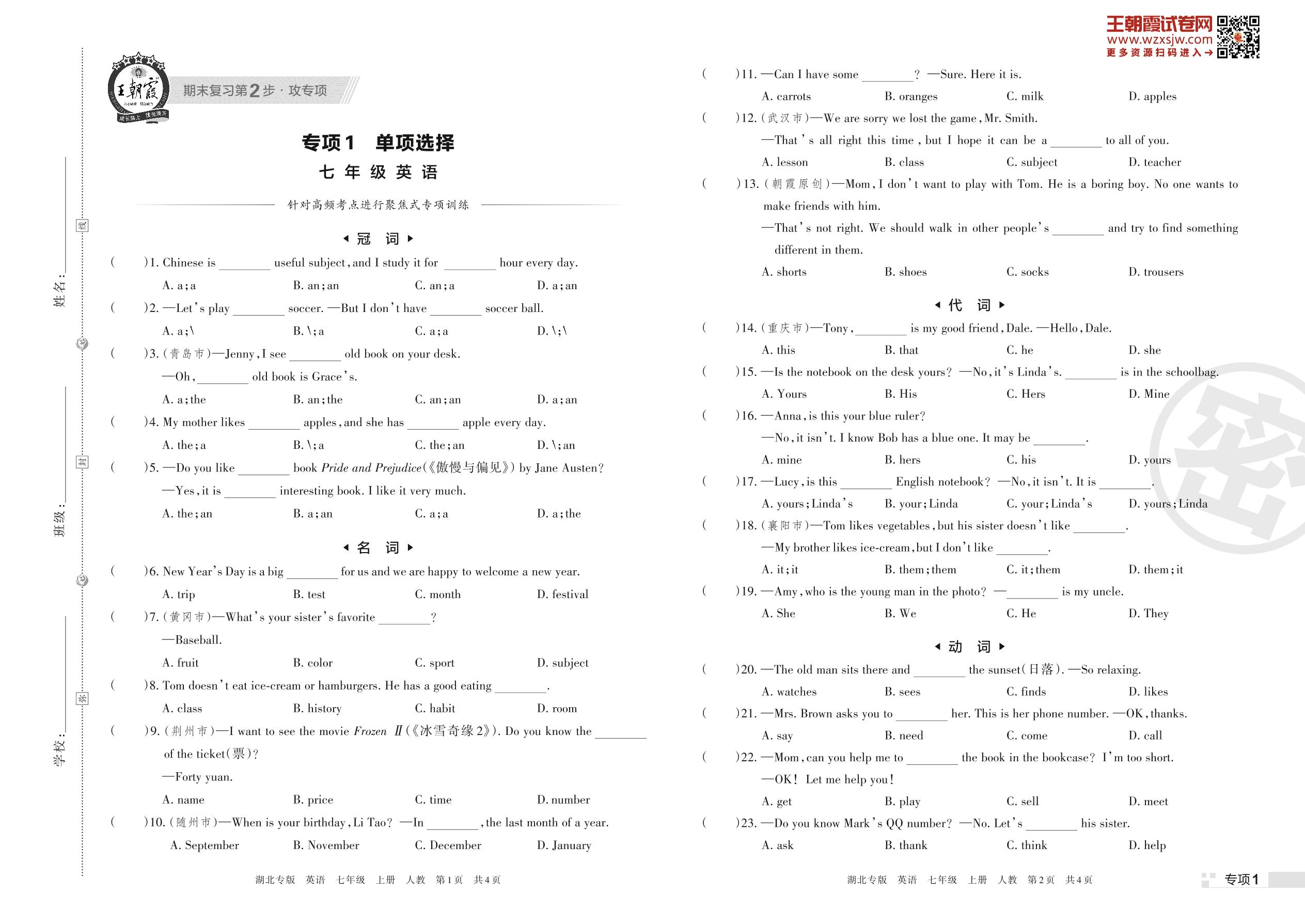 王朝霞期末专项卷——单项选择七年级上册英语(人教版)_R221125151112388【1】