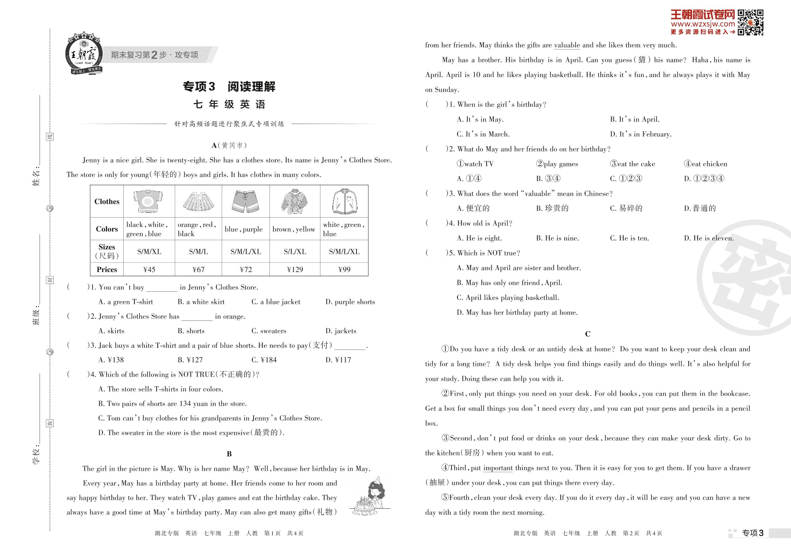 王朝霞期末专项卷——阅读理解七年级上册英语(人教版)_R221125151112578【3】