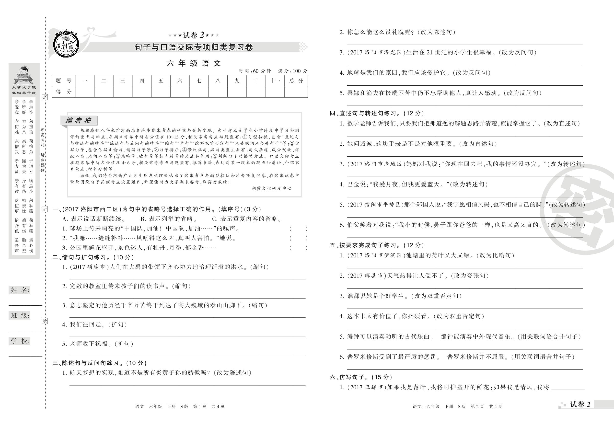 王朝霞期末专项卷——句子与口语交际专项归类复习卷六年级下册语文(S版)_R210802120723【2】