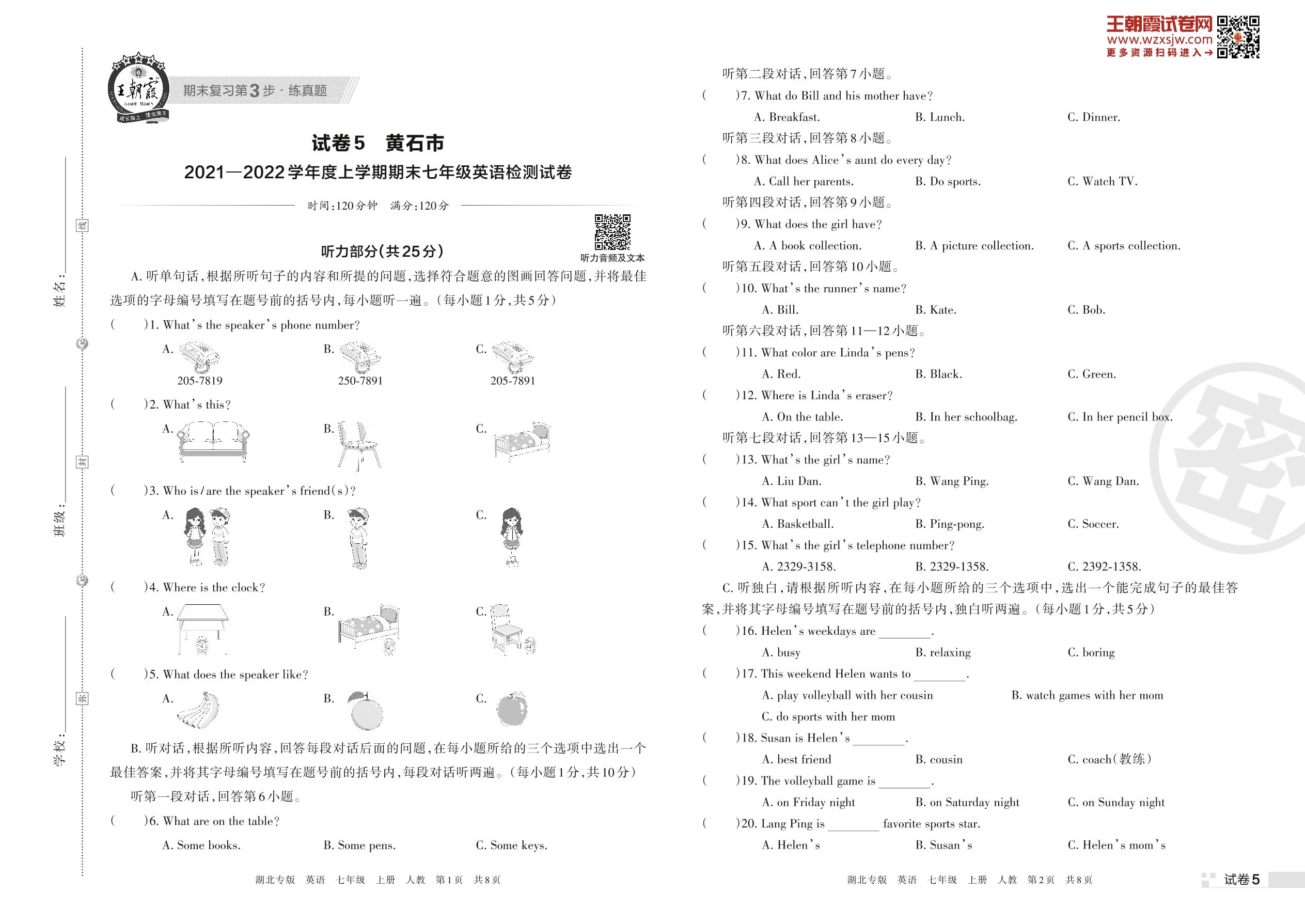 黄石市2021—2022学年度上学期期末七年级英语检测试卷(人教版)【5】