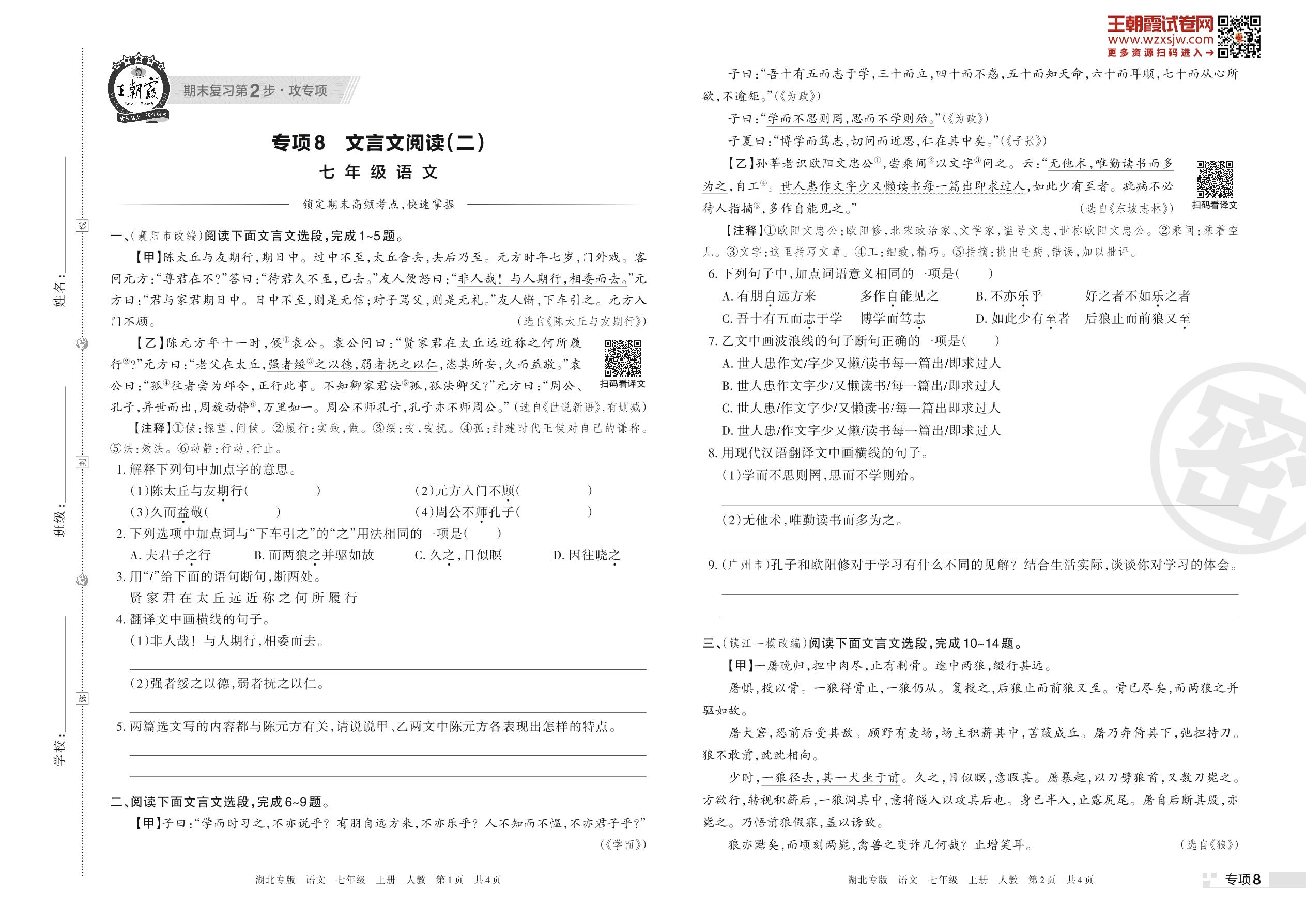 王朝霞期末专项卷——文言文阅读(二)七年级上册语文(人教版)【8】