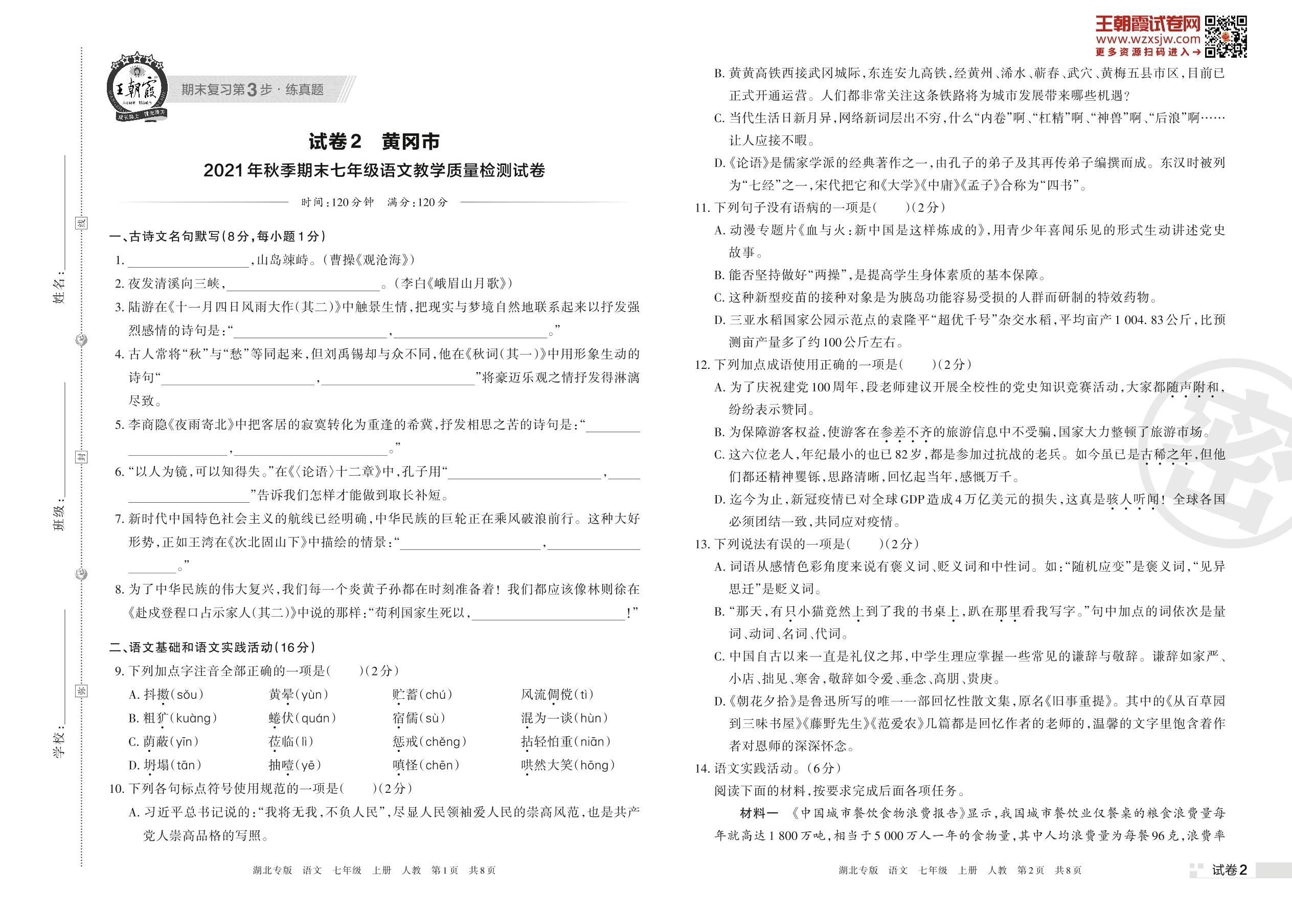 黄冈市2021年秋季期末七年级语文教学质量检测试卷(人教版)【2】