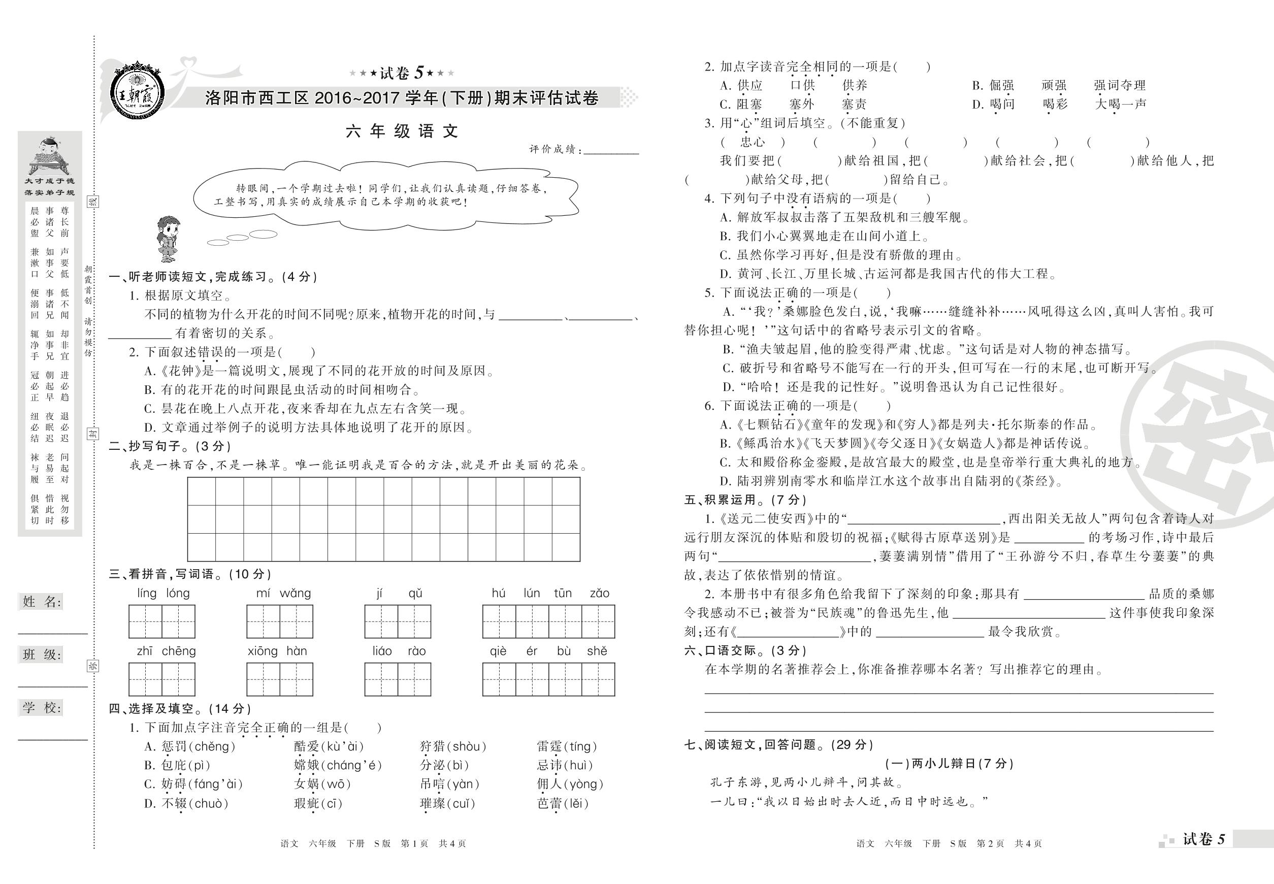 2016-2017学年第二学期洛阳市西工区六年级语文试卷(S版)【5】