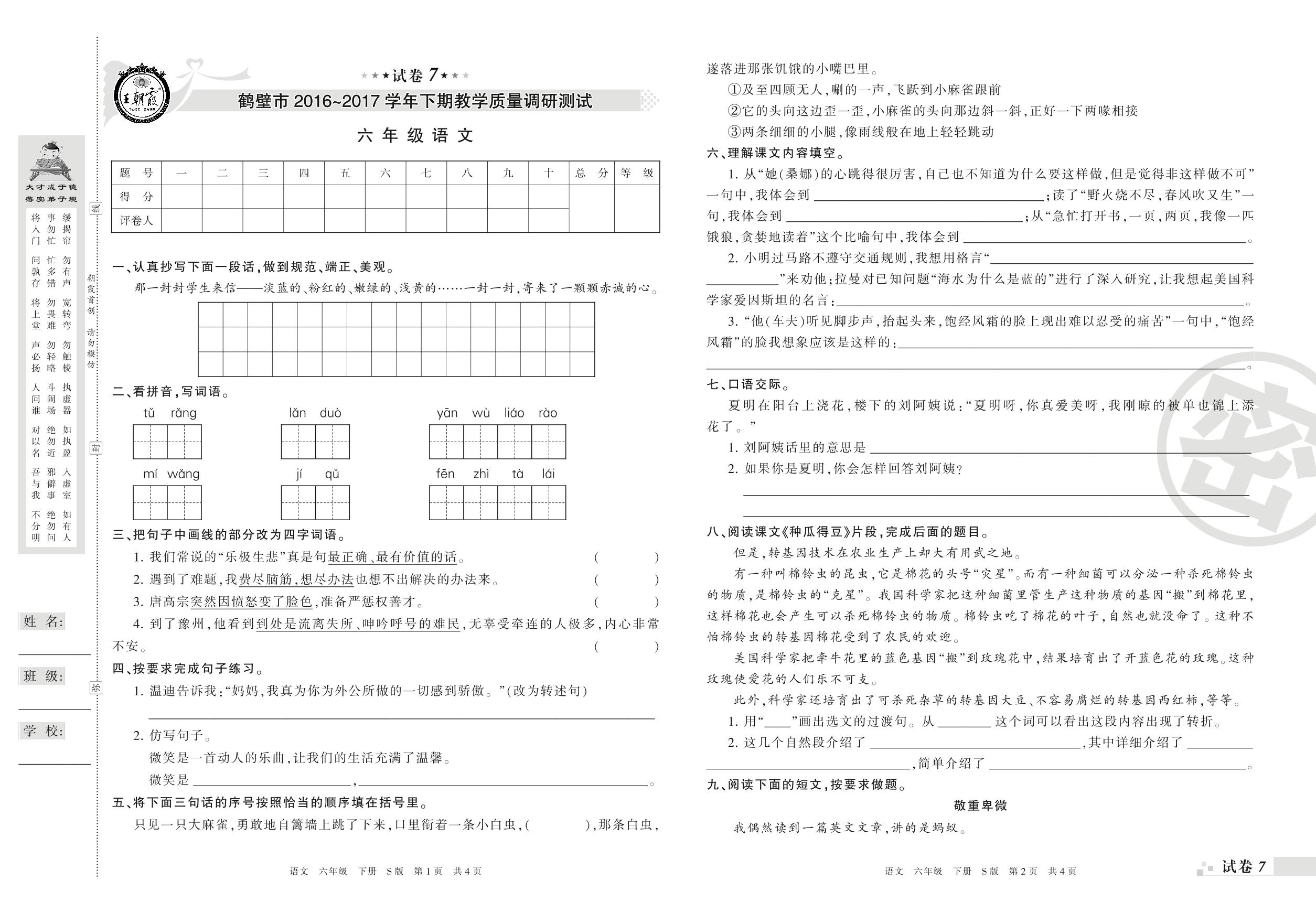 2016-2017学年第二学期鹤壁市六年级语文试卷(S版)【7】