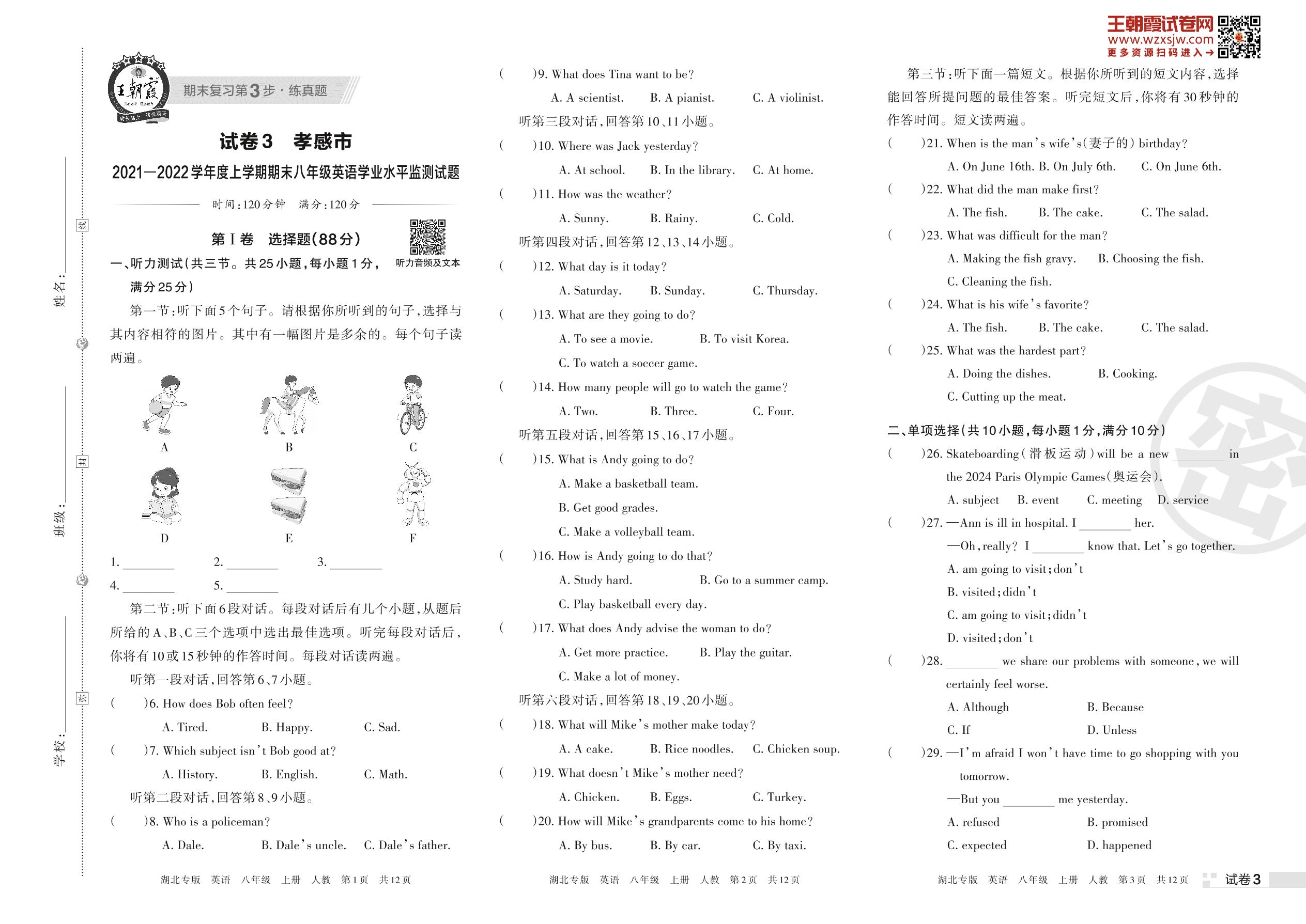 孝感市2021—2022学年度上学期期末八年级英语学业水平监测试题(人教版)【3】