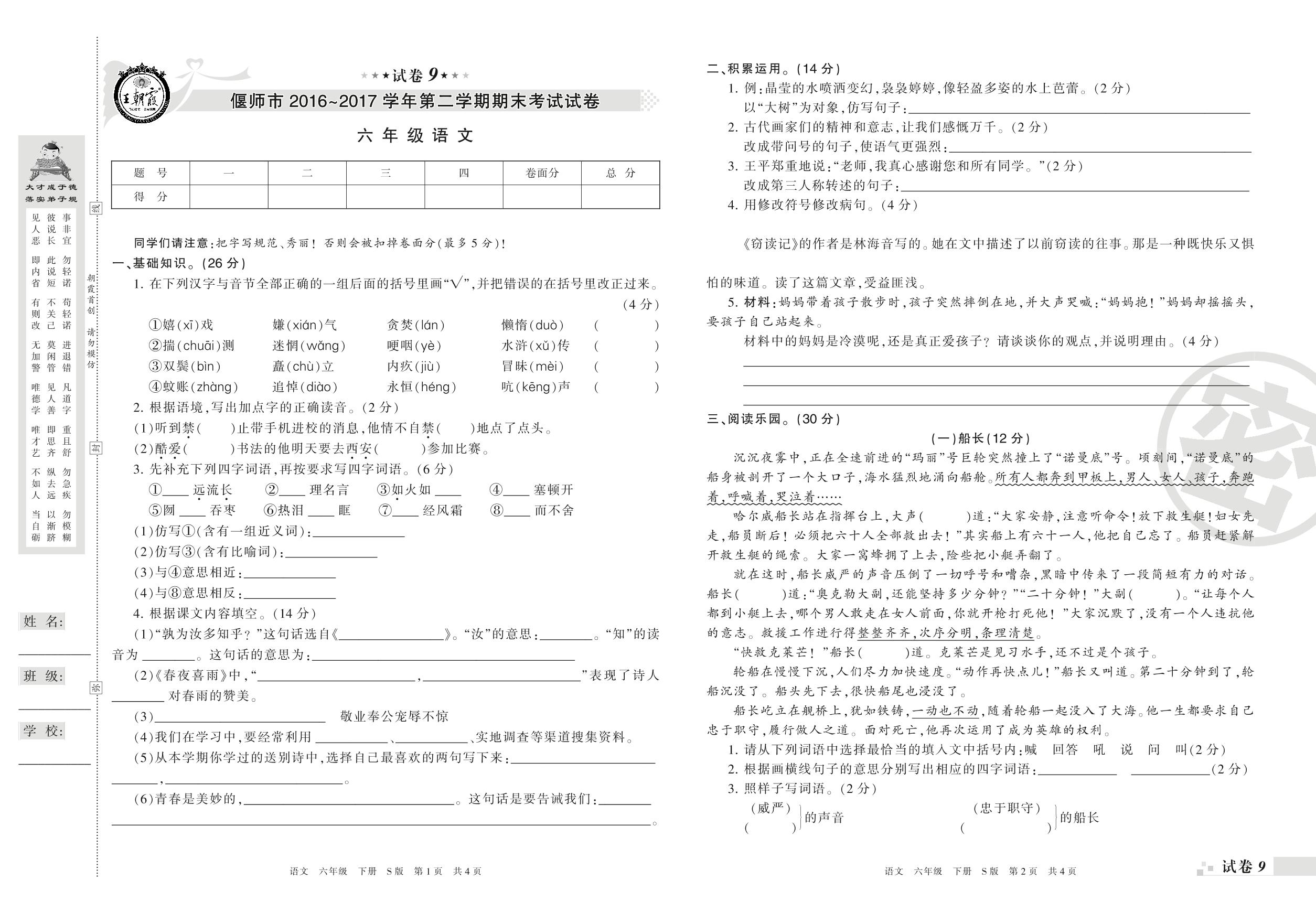 2016-2017学年第二学期偃师市六年级语文试卷(S版)【9】