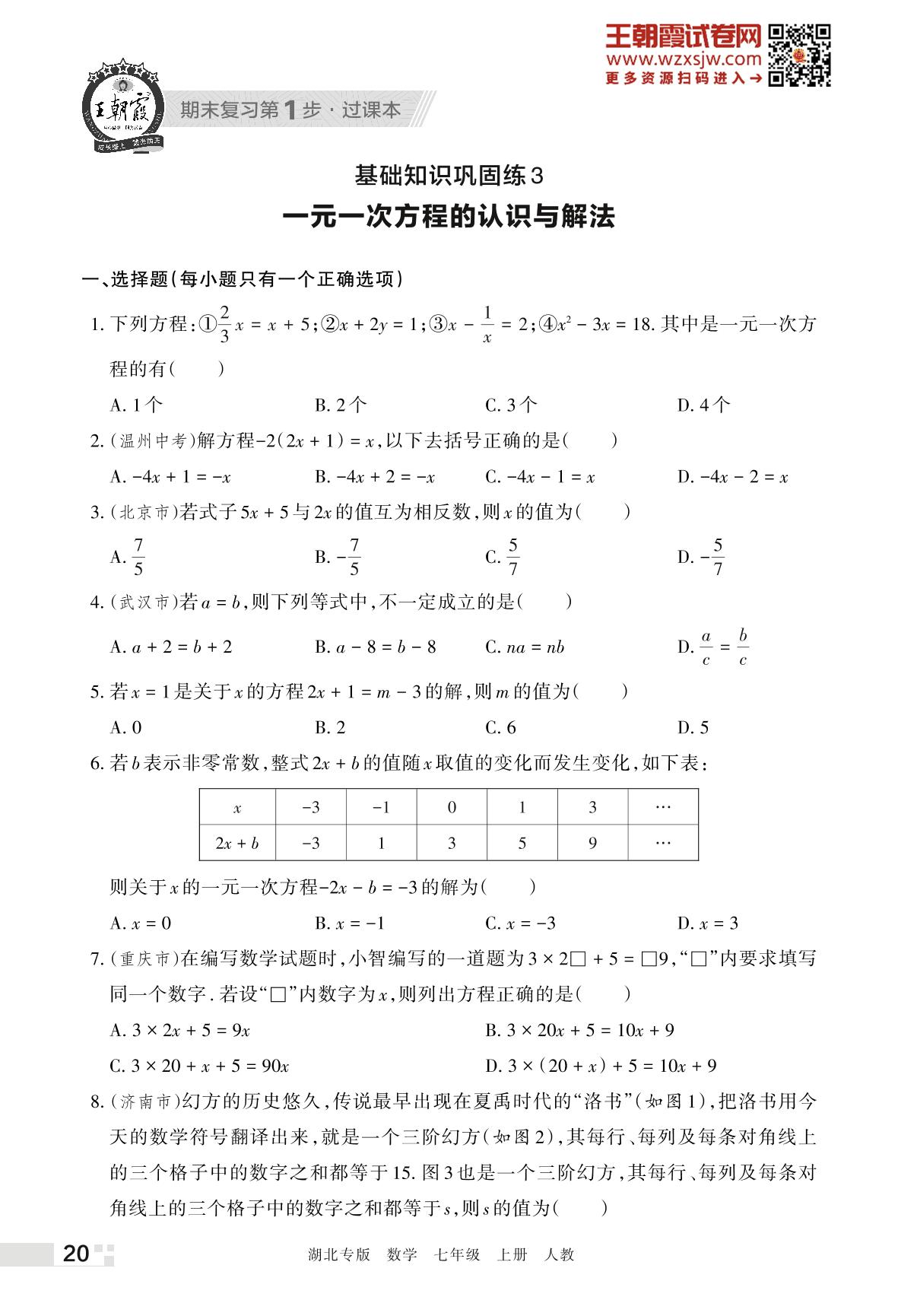 王朝霞期末过课本——基础知识巩固练3 一元一次方程的认识与解法七年级上册数学(人教版)_R221125155855874