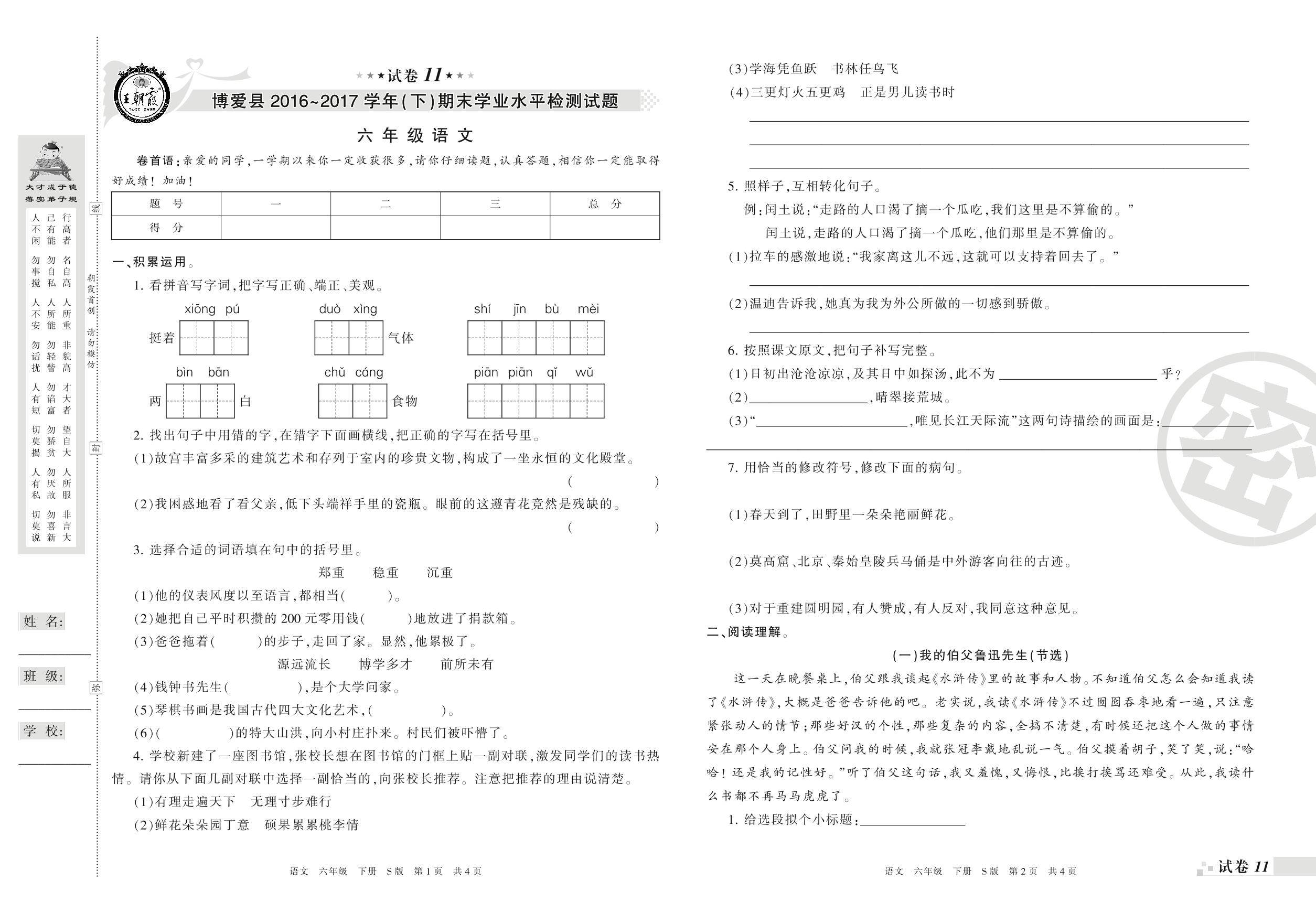 2016-2017学年第二学期焦作市博爱县六年级语文试卷(S版)【11】