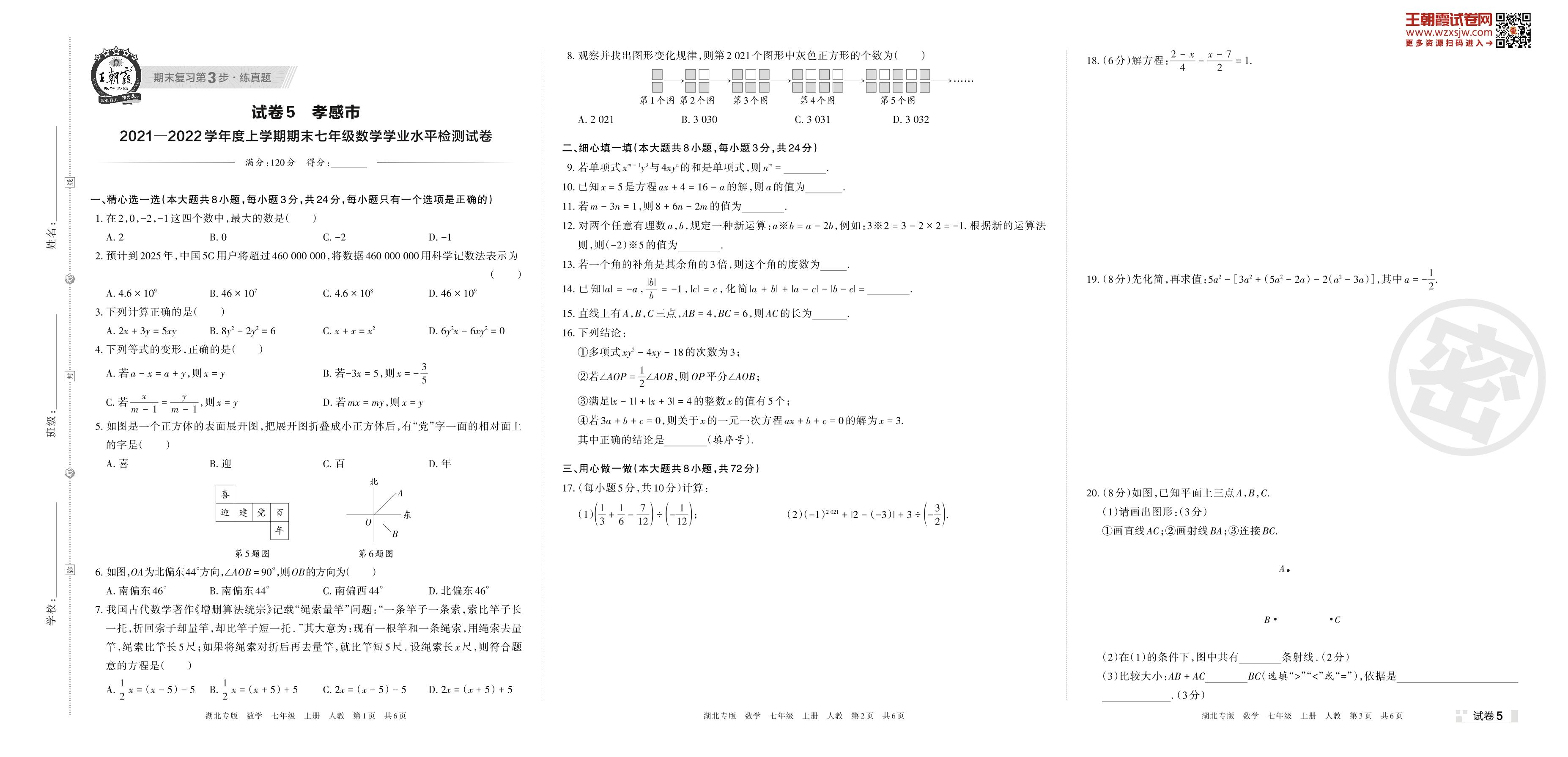 孝感市2021—2022学年度上学期期末七年级数学学业水平检测试卷(人教版)【5】