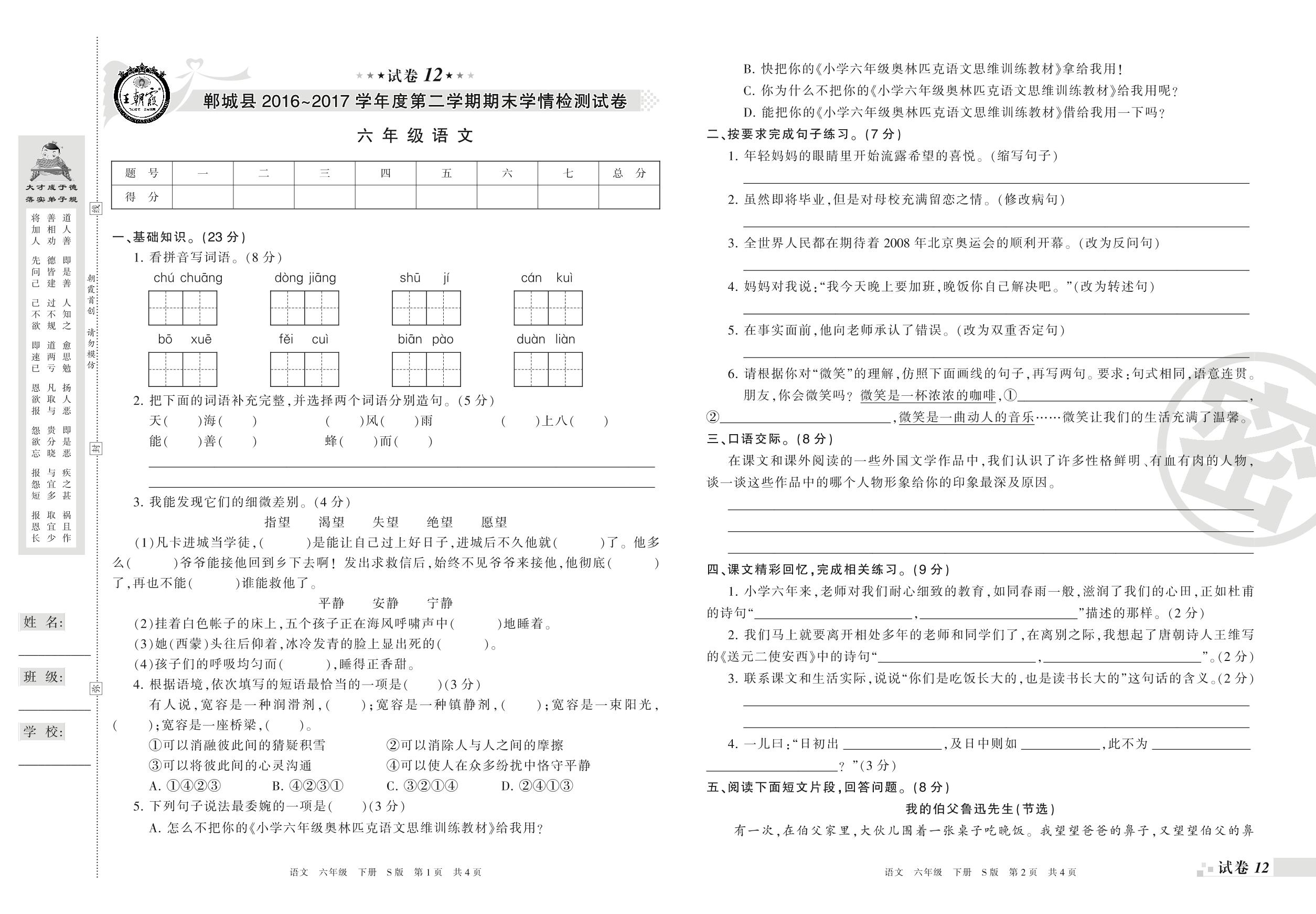 2016-2017学年第二学期周口市郸城县六年级语文试卷(S版)【12】