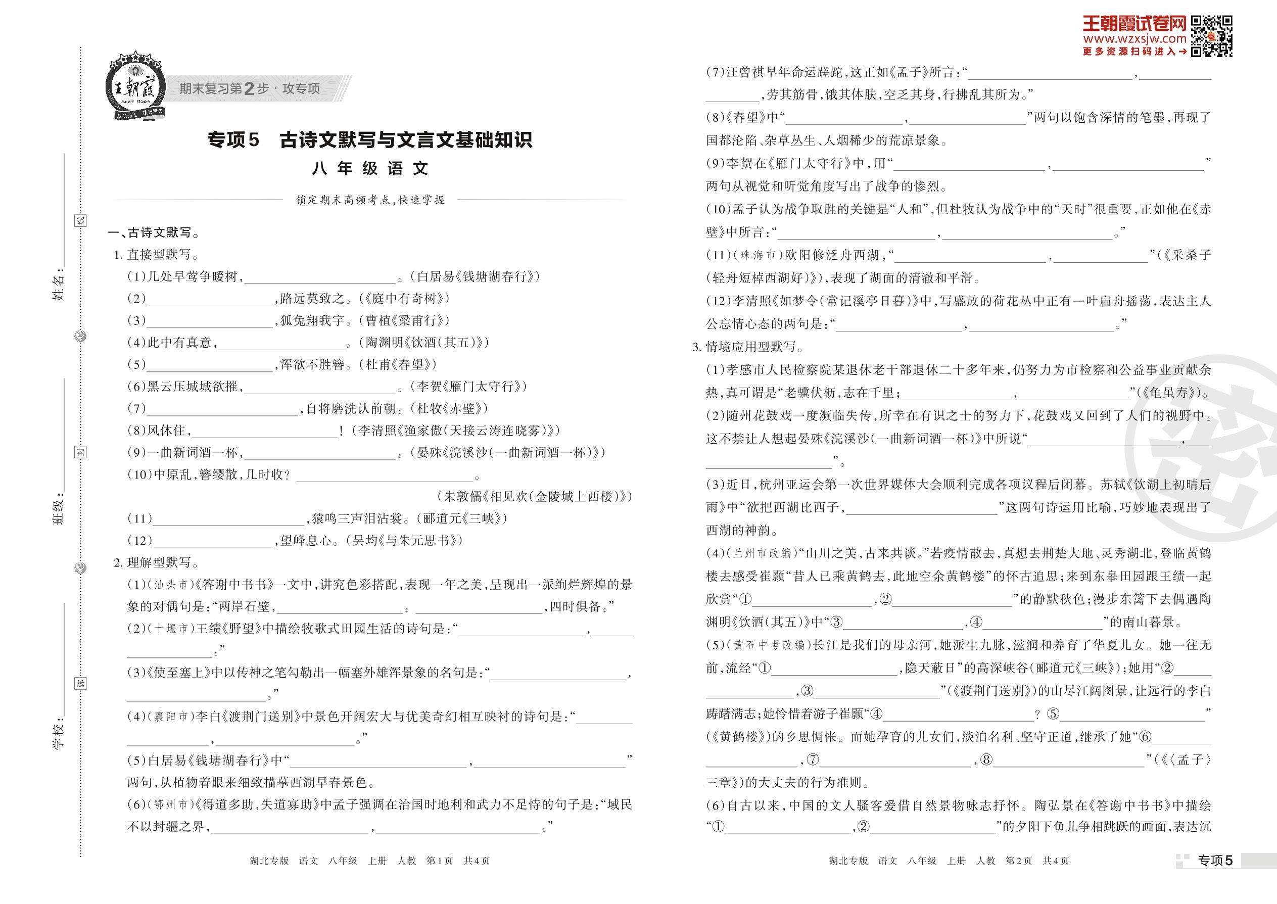 王朝霞期末专项卷——古诗文默写与文言文基础知识八年级上册语文(人教版)【5】