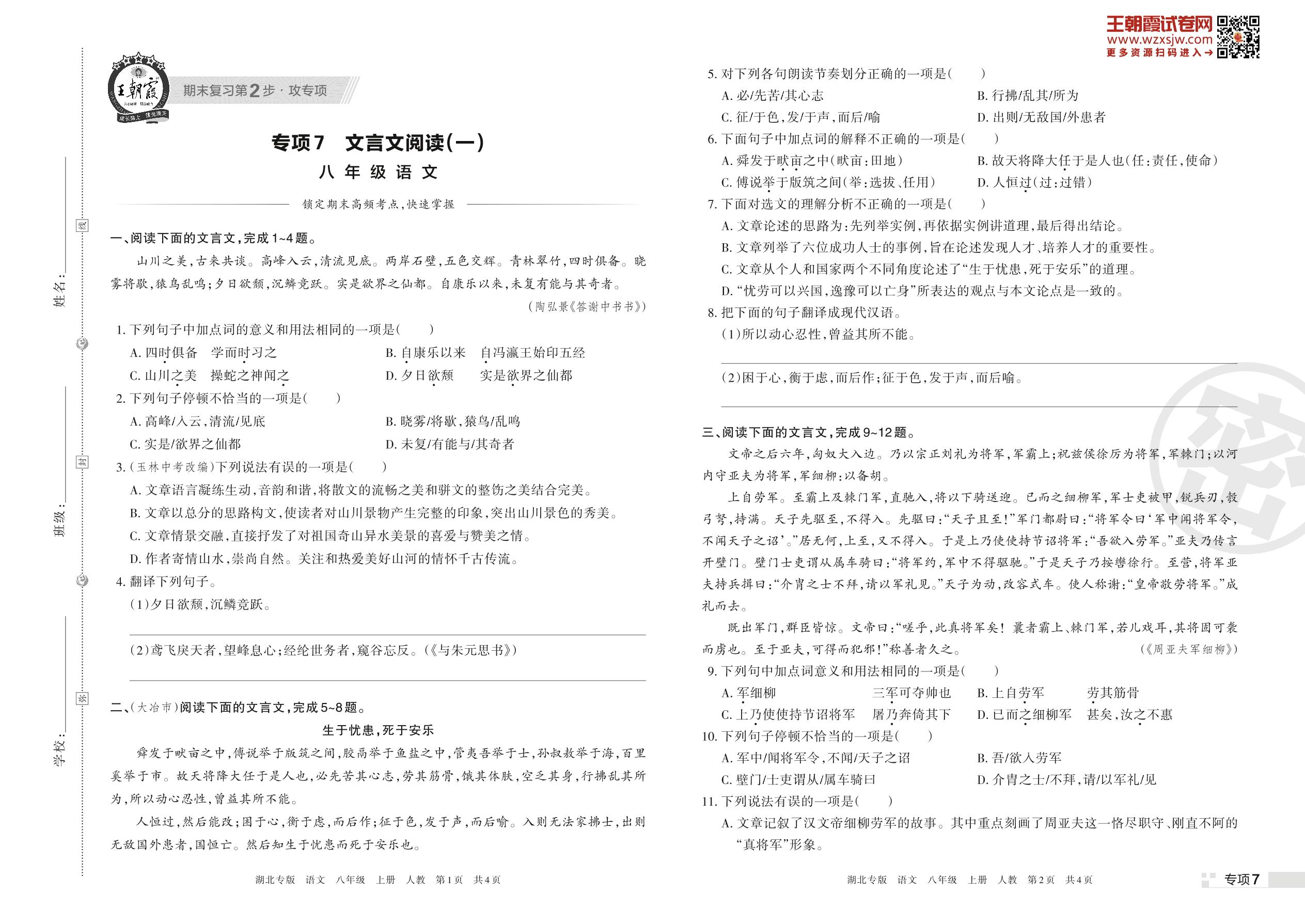 王朝霞期末专项卷——文言文阅读(一)八年级上册语文(人教版)【7】