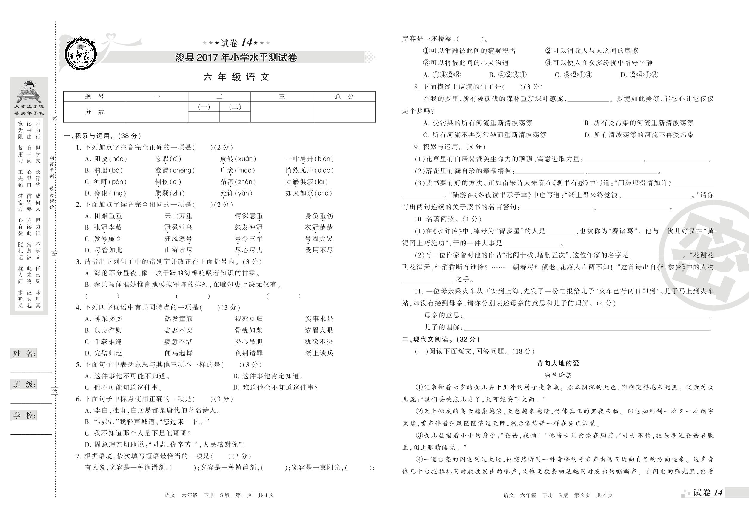 2016-2017学年第二学期鹤壁市浚县六年级语文试卷(S版)【14】