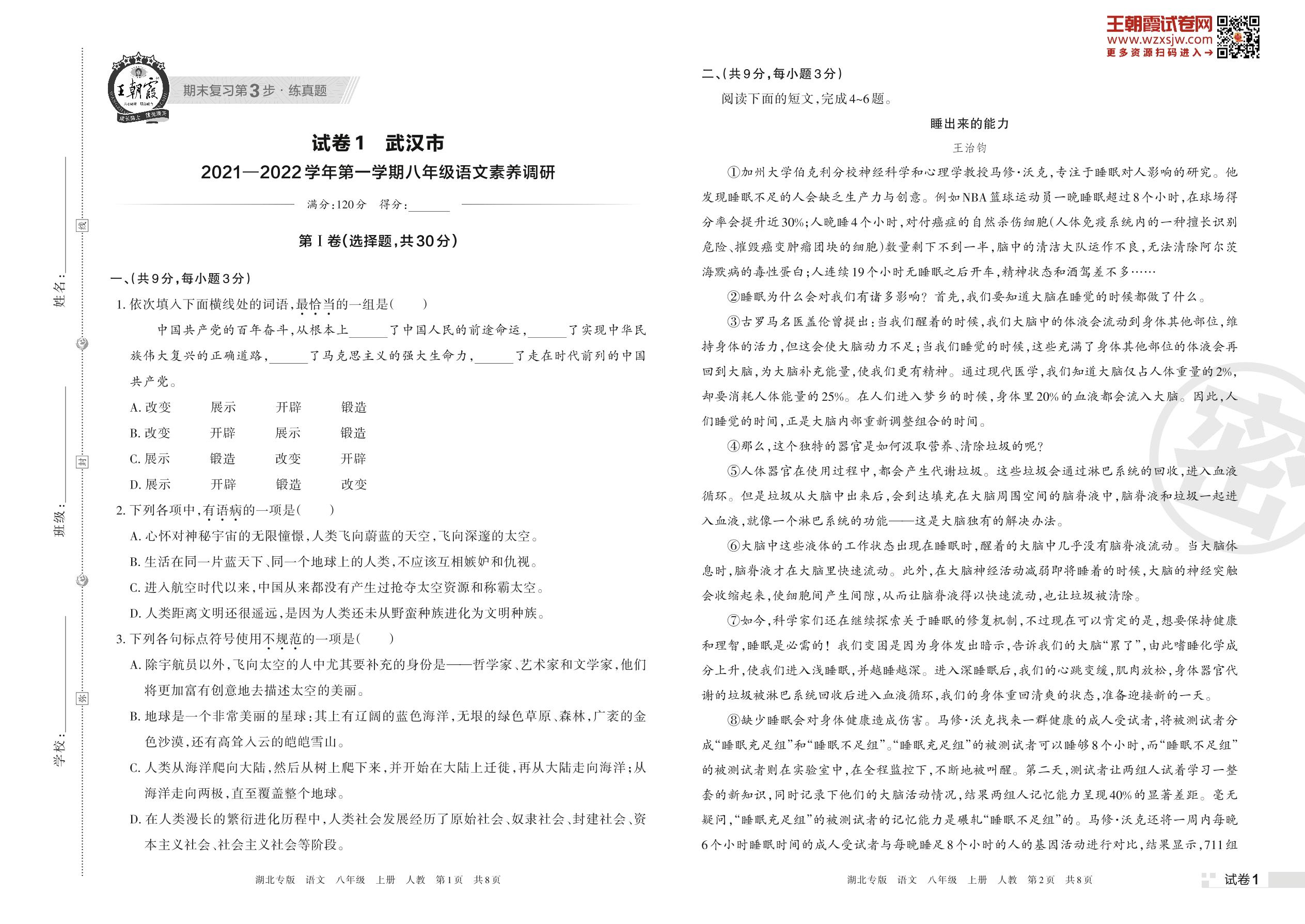 武汉市2021—2022学年第一学期八年级语文素养调研(人教版)【1】