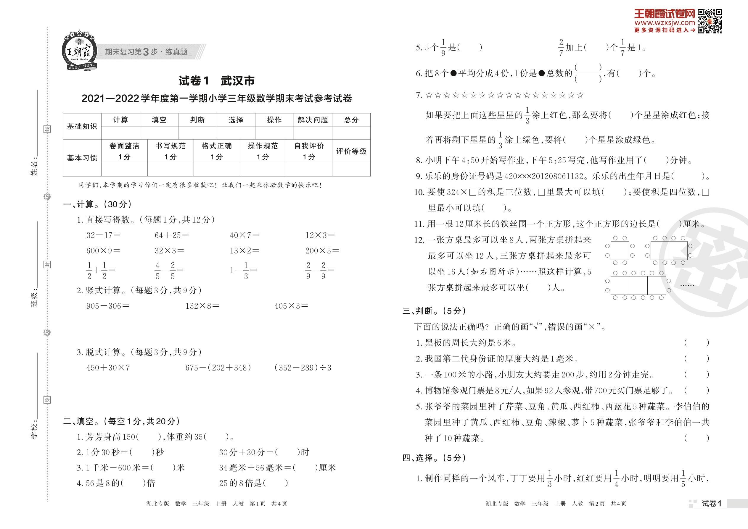 武汉市2021—2022学年度第一学期小学三年级数学期末考试参考试卷(人教版)【1】
