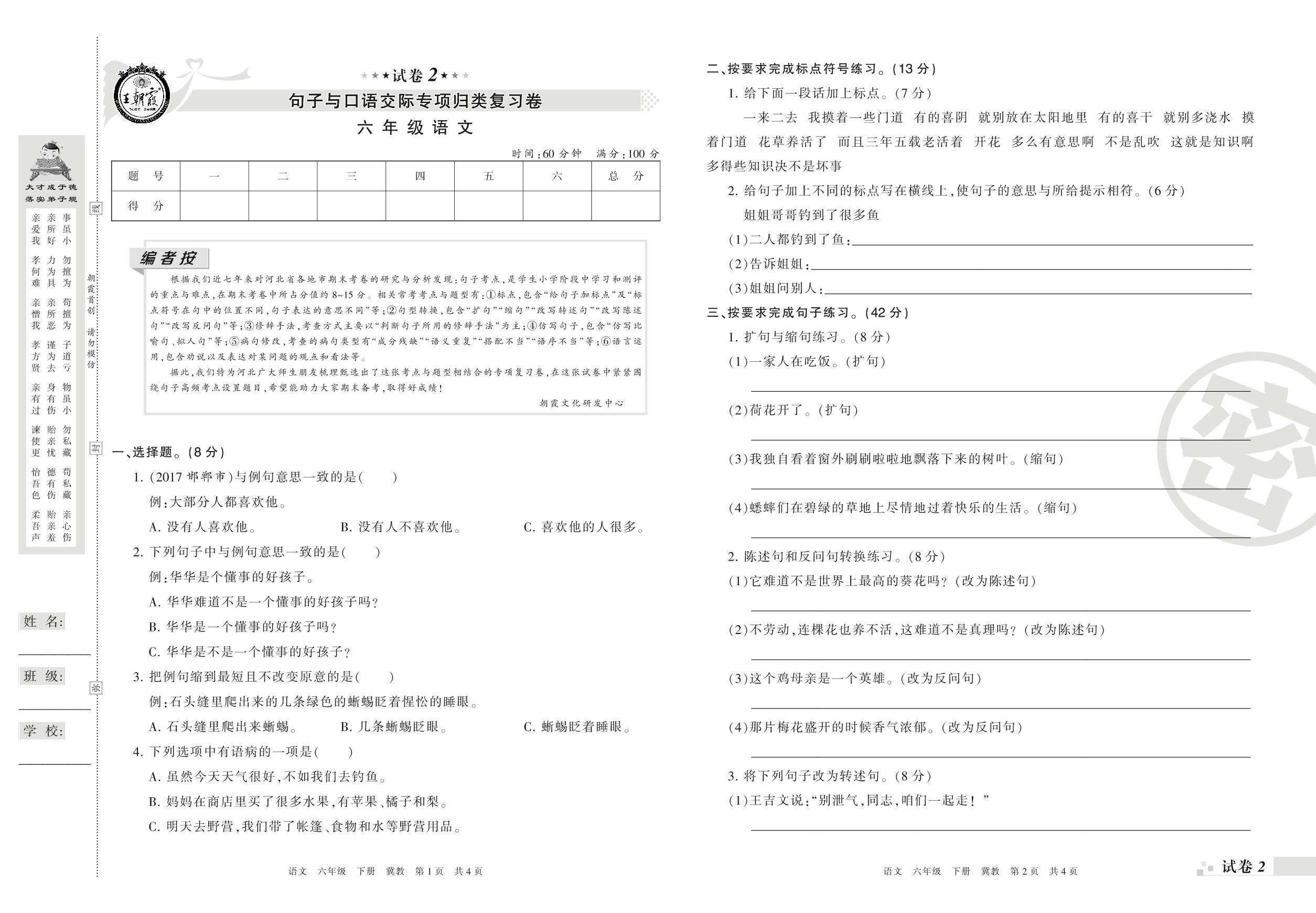 王朝霞期末专项卷——句子与口语交际专项归类复习卷六年级下册语文(冀教版)_R210802120801【2】