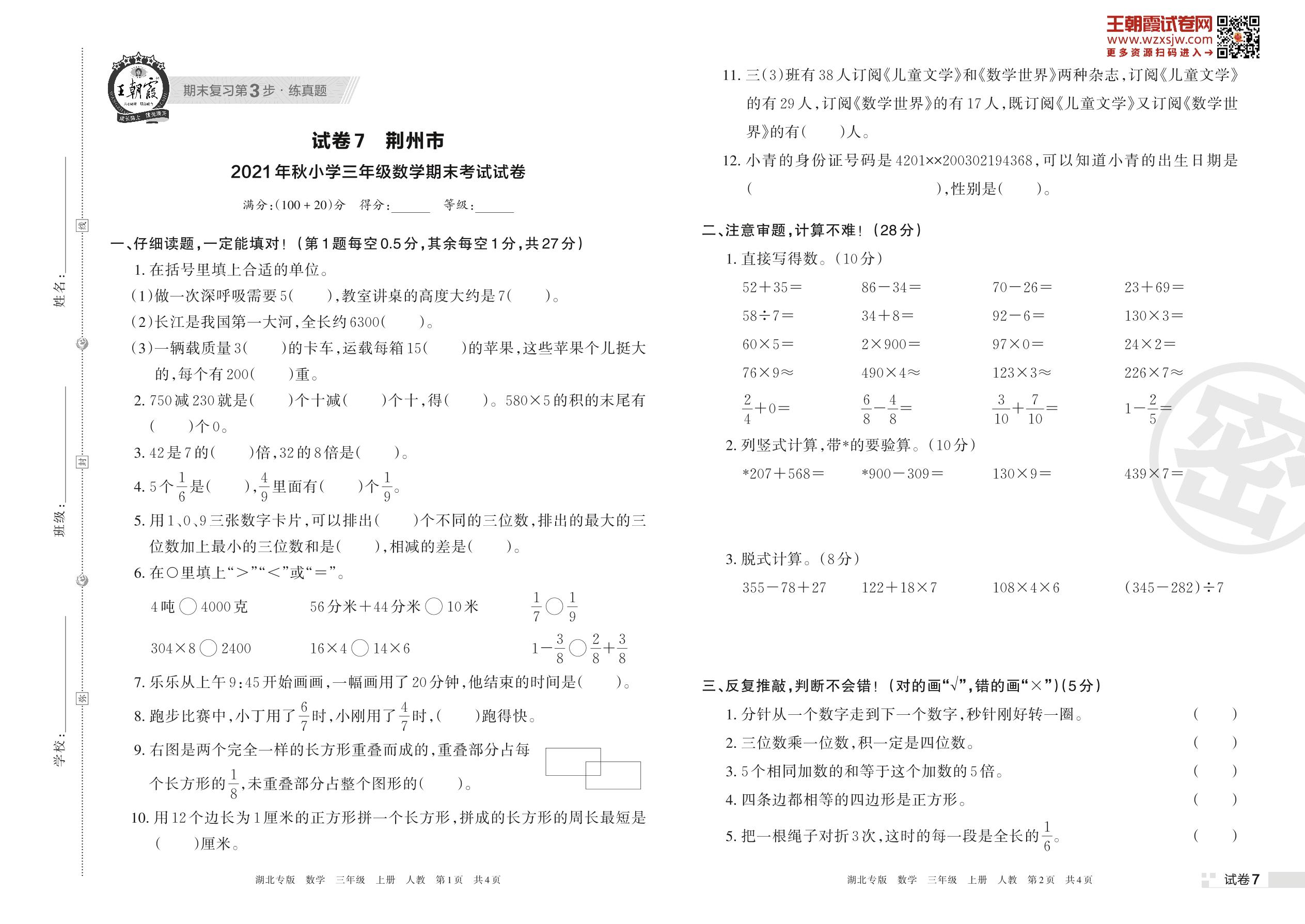 荆州市2021年秋小学三年级数学期末考试试卷(人教版)【7】