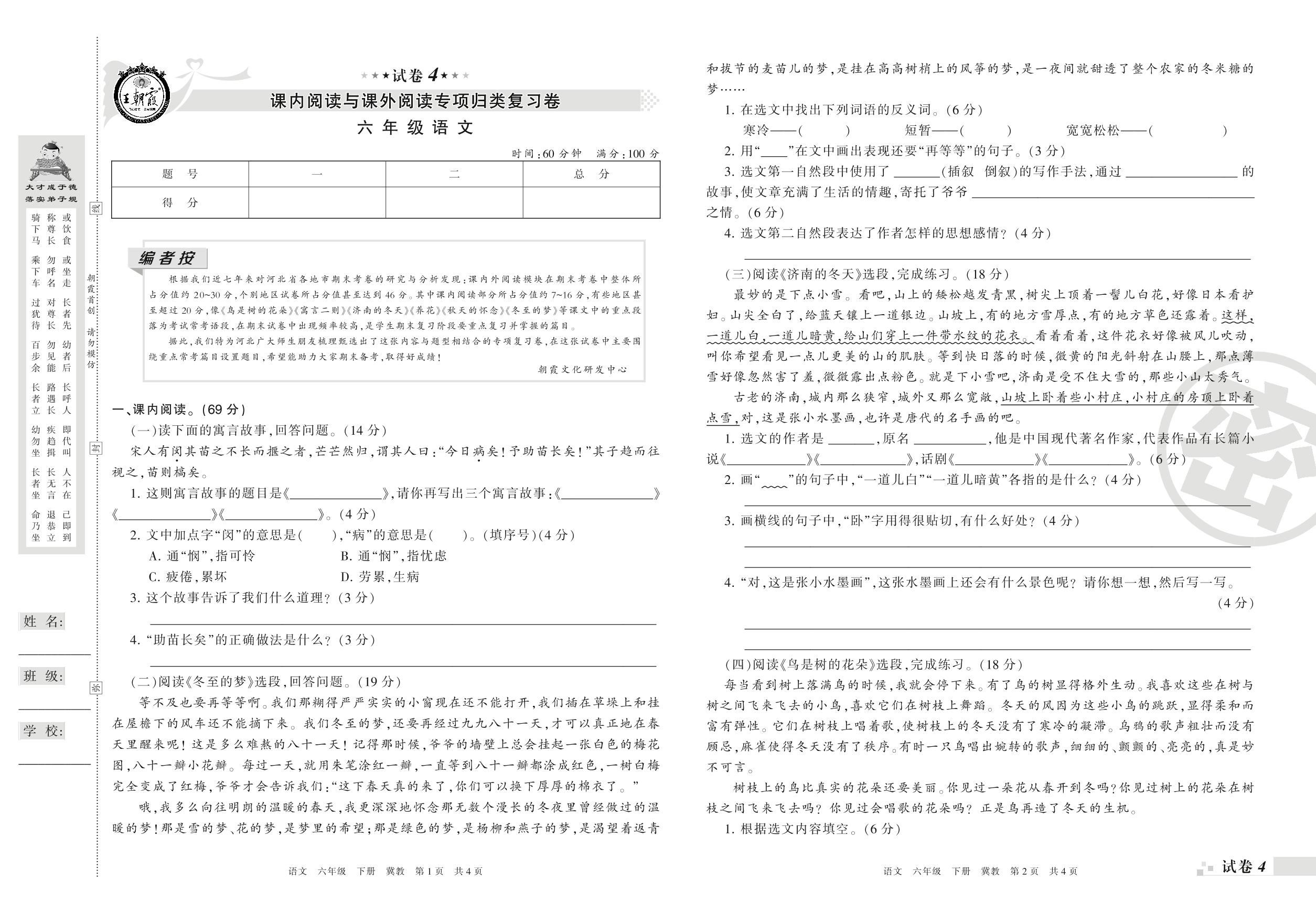 王朝霞期末专项卷——课内阅读与课外阅读专项归类复习卷六年级下册语文(冀教版)_R210802120807【4】