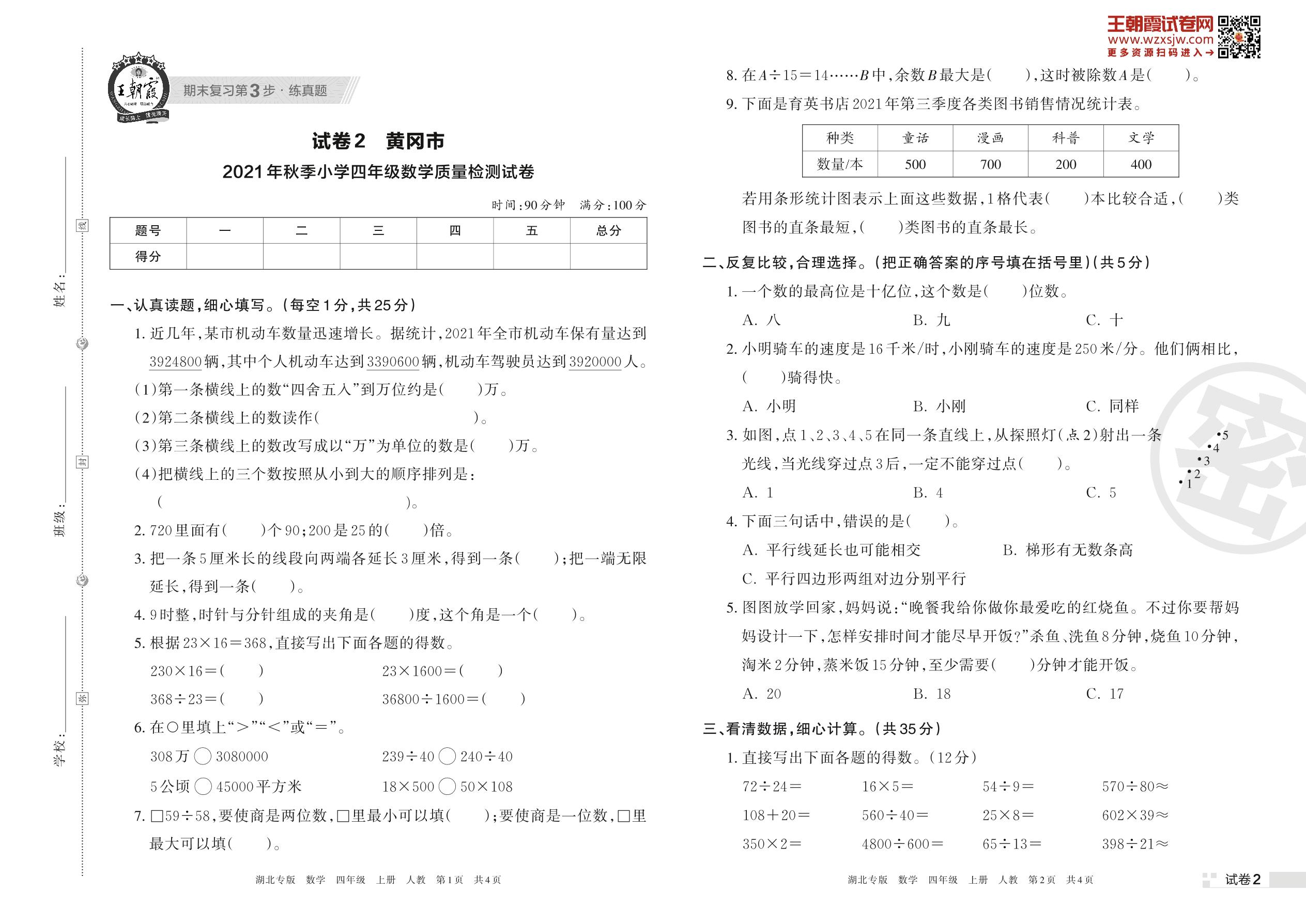黄冈市2021年秋季小学四年级数学质量检测试卷(人教版)【2】