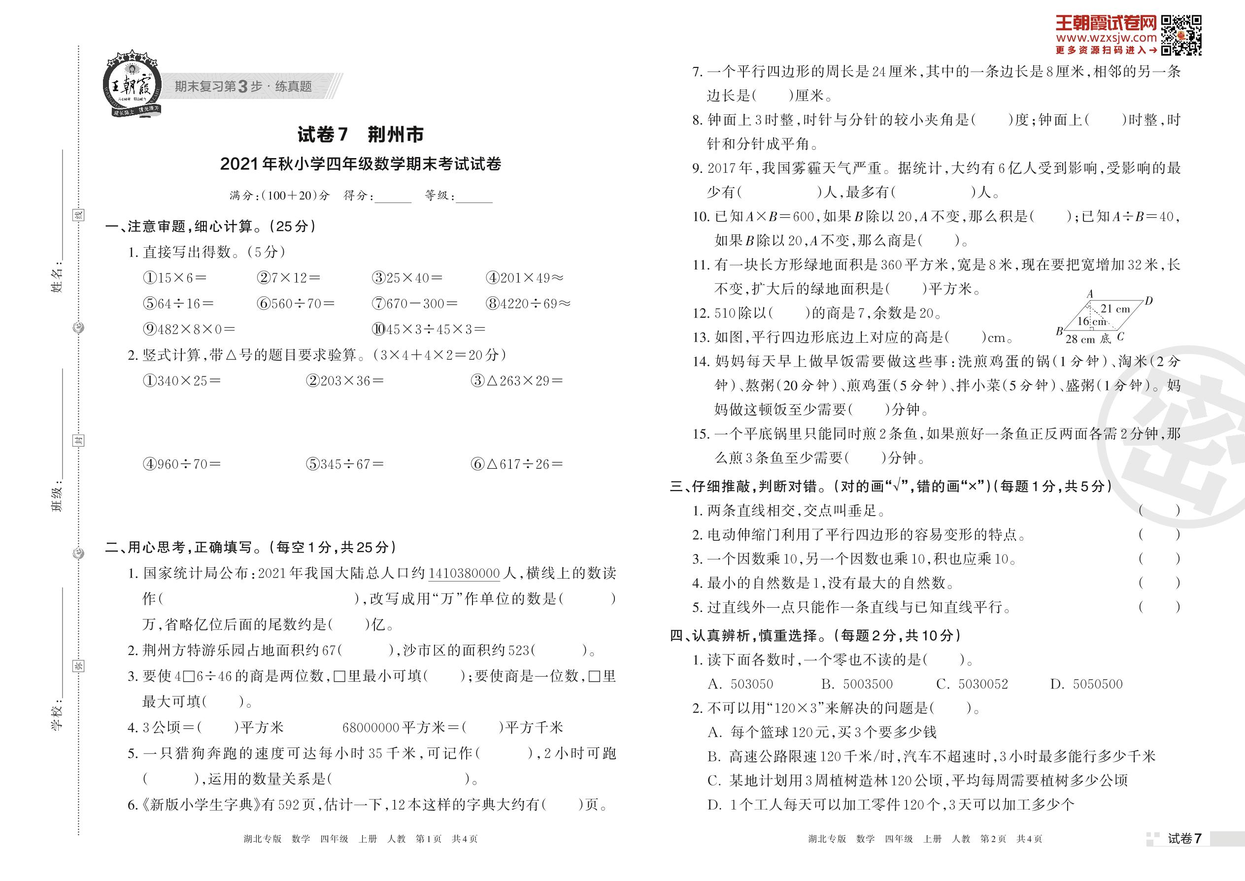 荆州市2021年秋小学四年级数学期末考试试卷(人教版)【7】