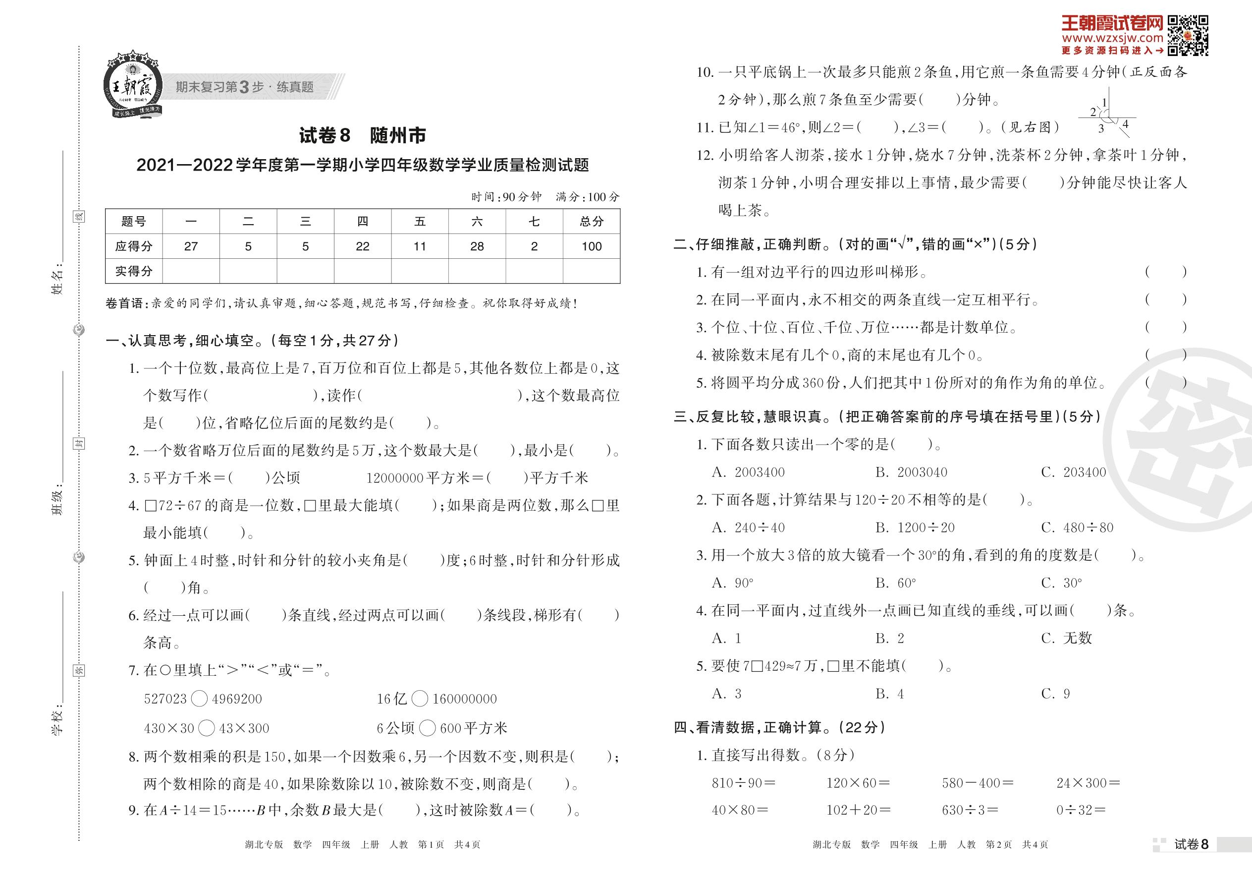 随州市2021—2022学年度第一学期小学四年级数学学业质量检测试题 (人教版)【8】