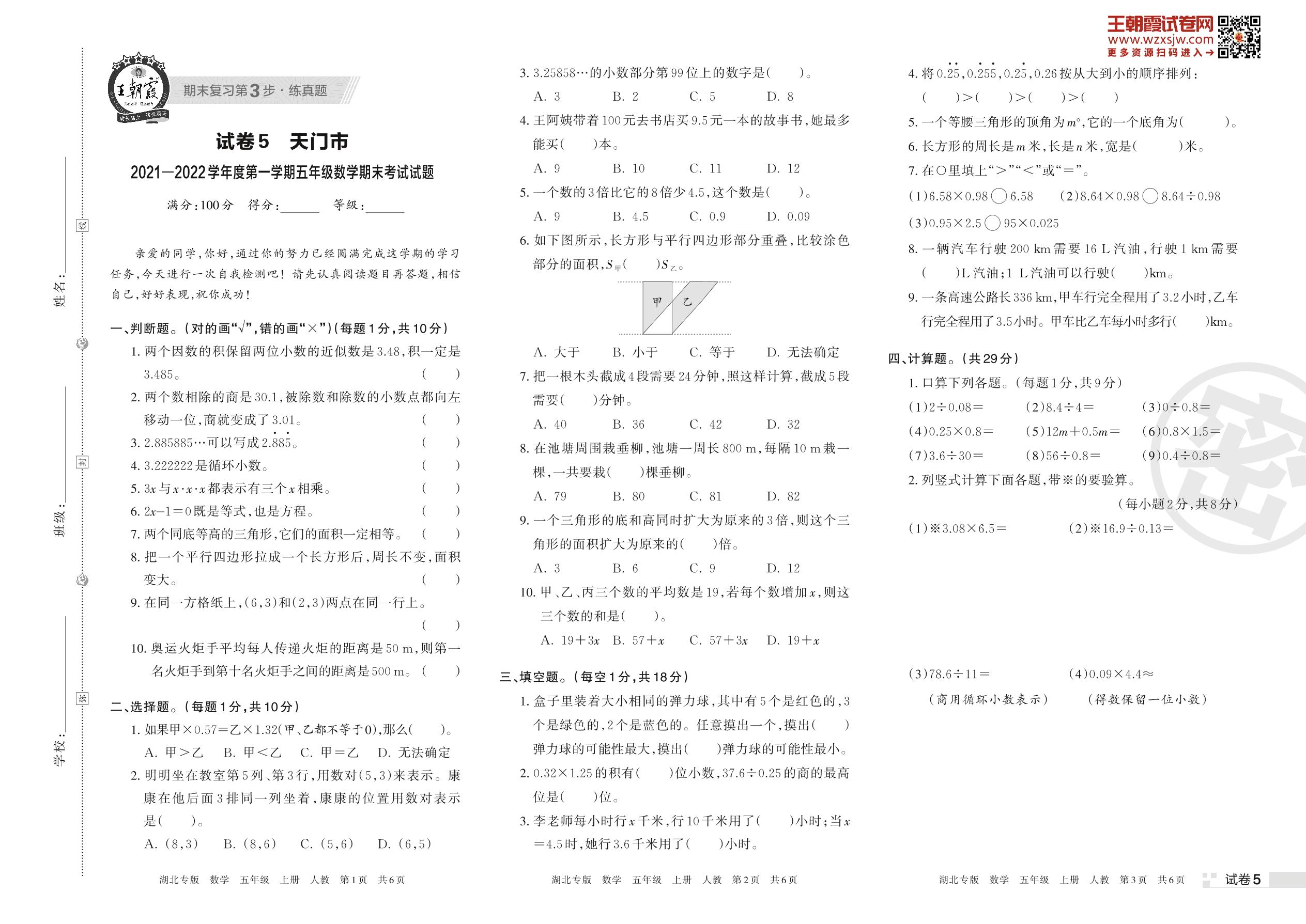 天门市2021—2022学年度第一学期五年级数学期末考试试题(人教版)【5】