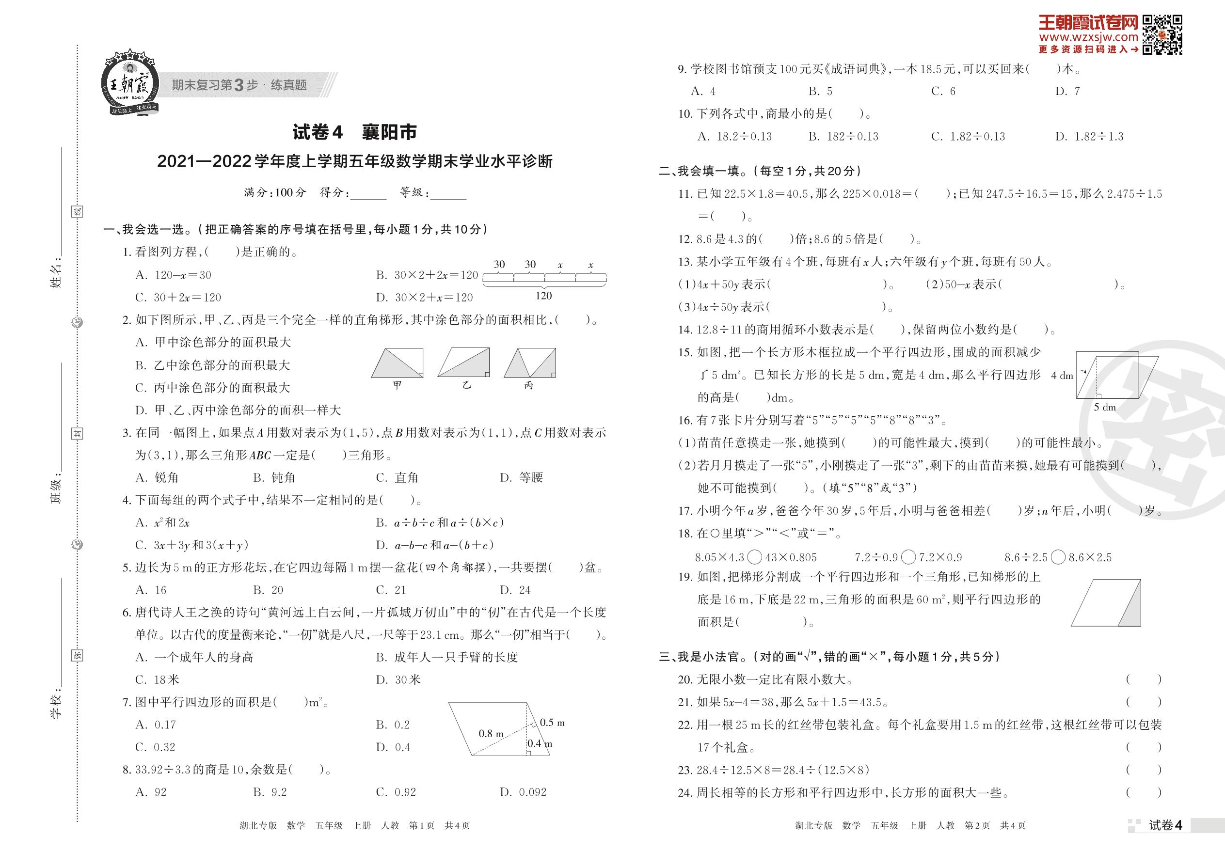 襄阳市2021—2022学年度上学期五年级数学期末学业水平诊断(人教版)【4】