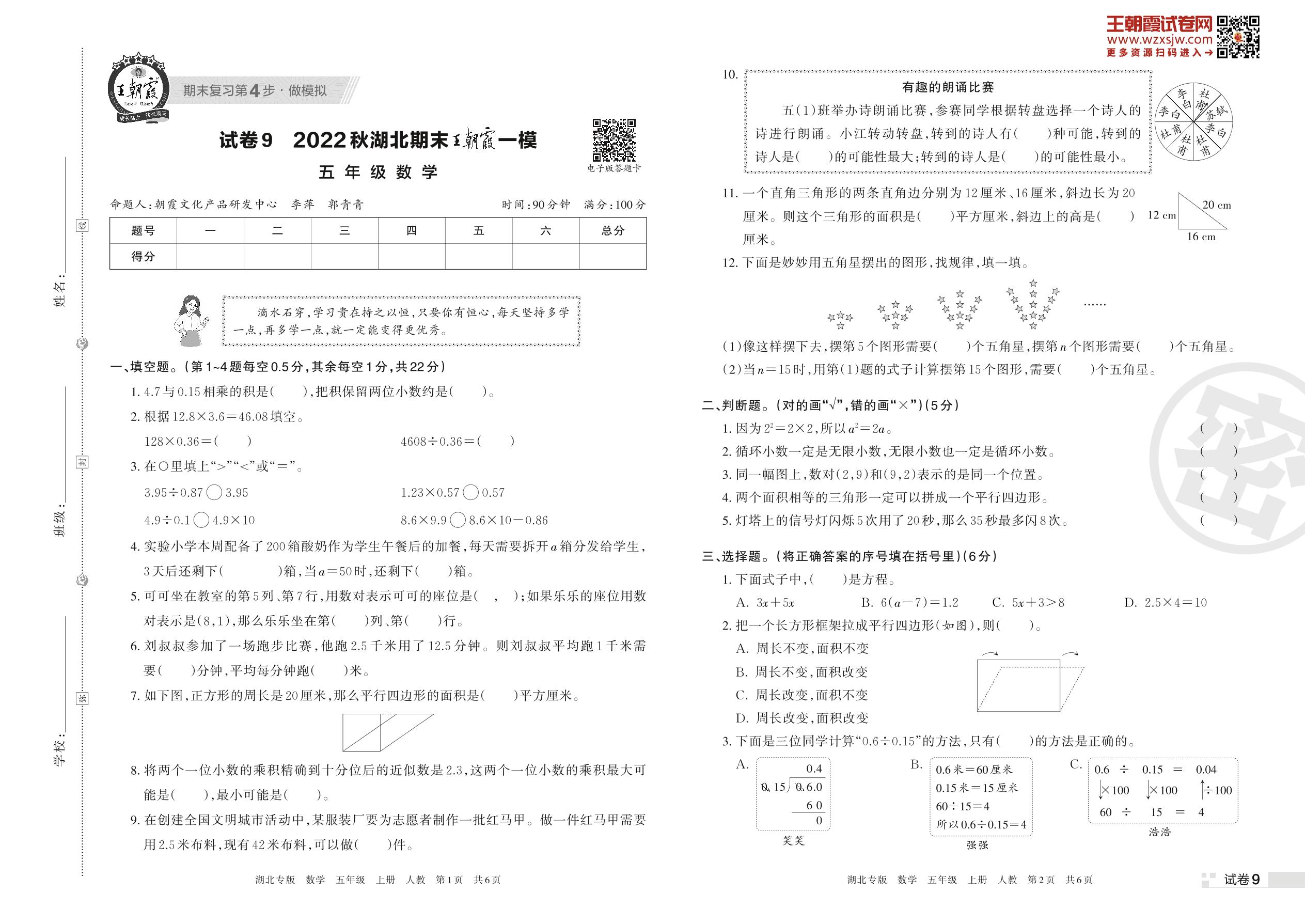 王朝霞期末模拟卷五年级上册数学(人教版)_R221125164523955【9】