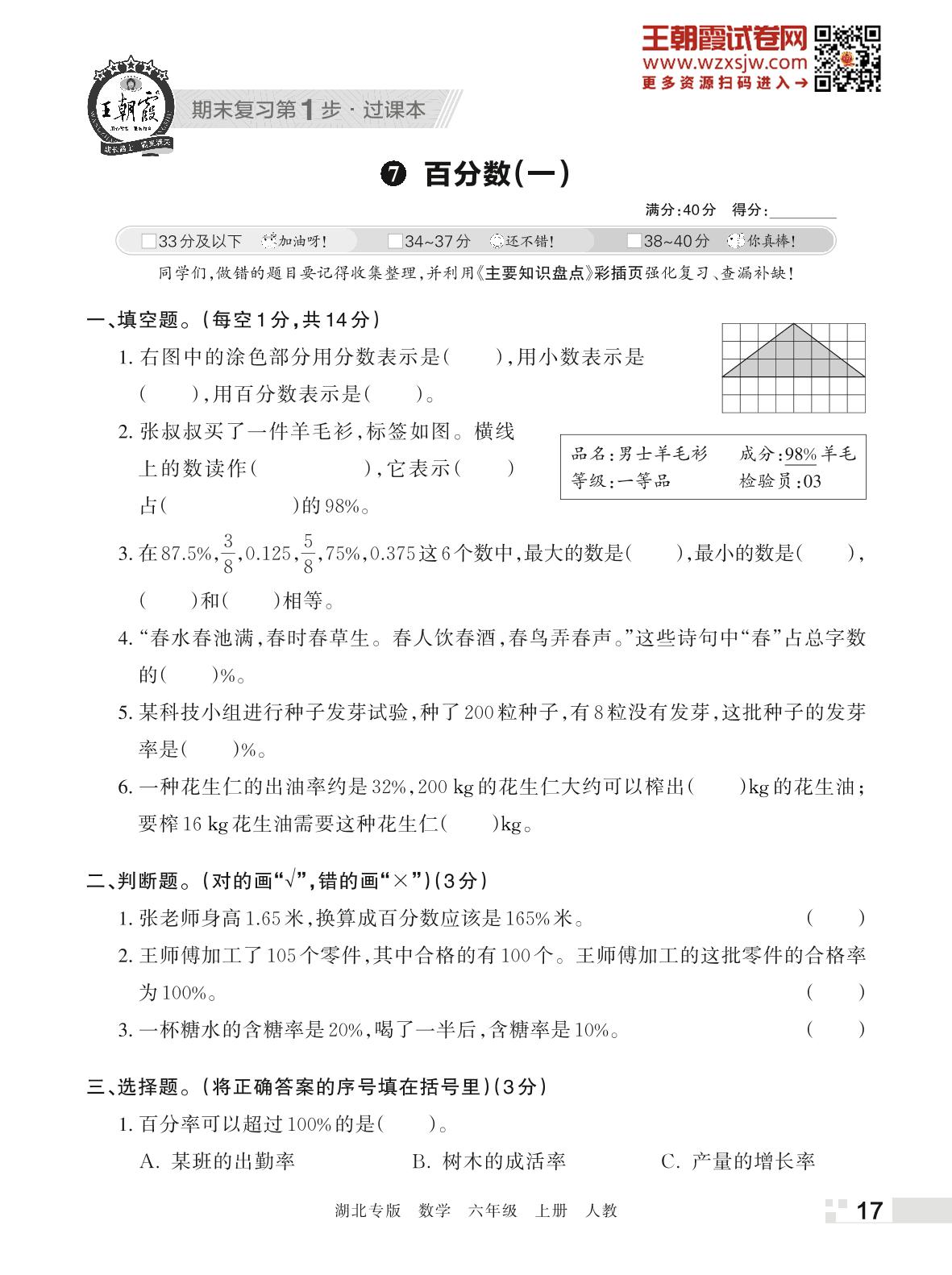 王朝霞期末过课本——7 百分数(一)六年级上册数学(人教版)_R221125165546490