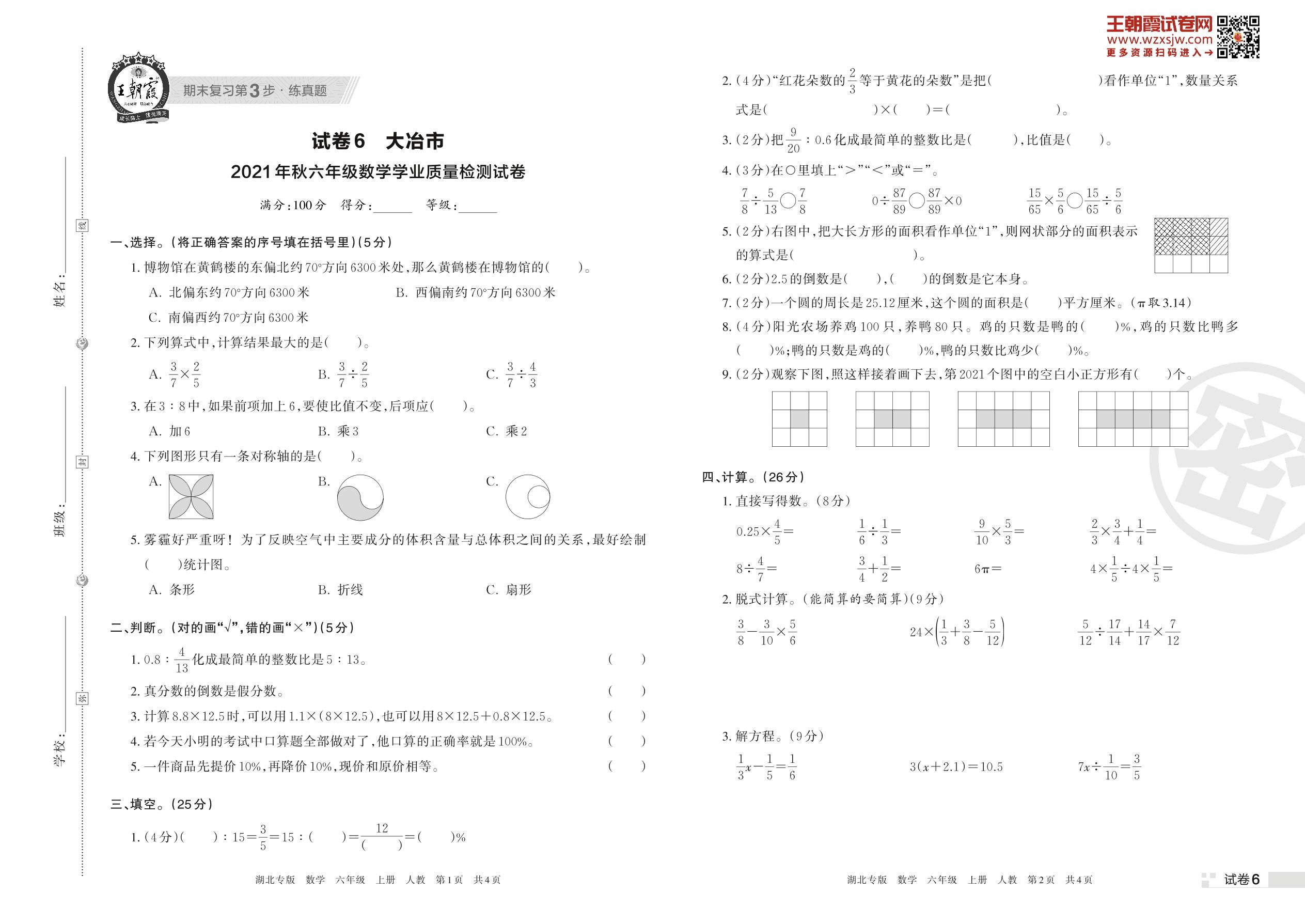 大冶市2021年秋六年级数学学业质量检测试卷(人教版)【6】