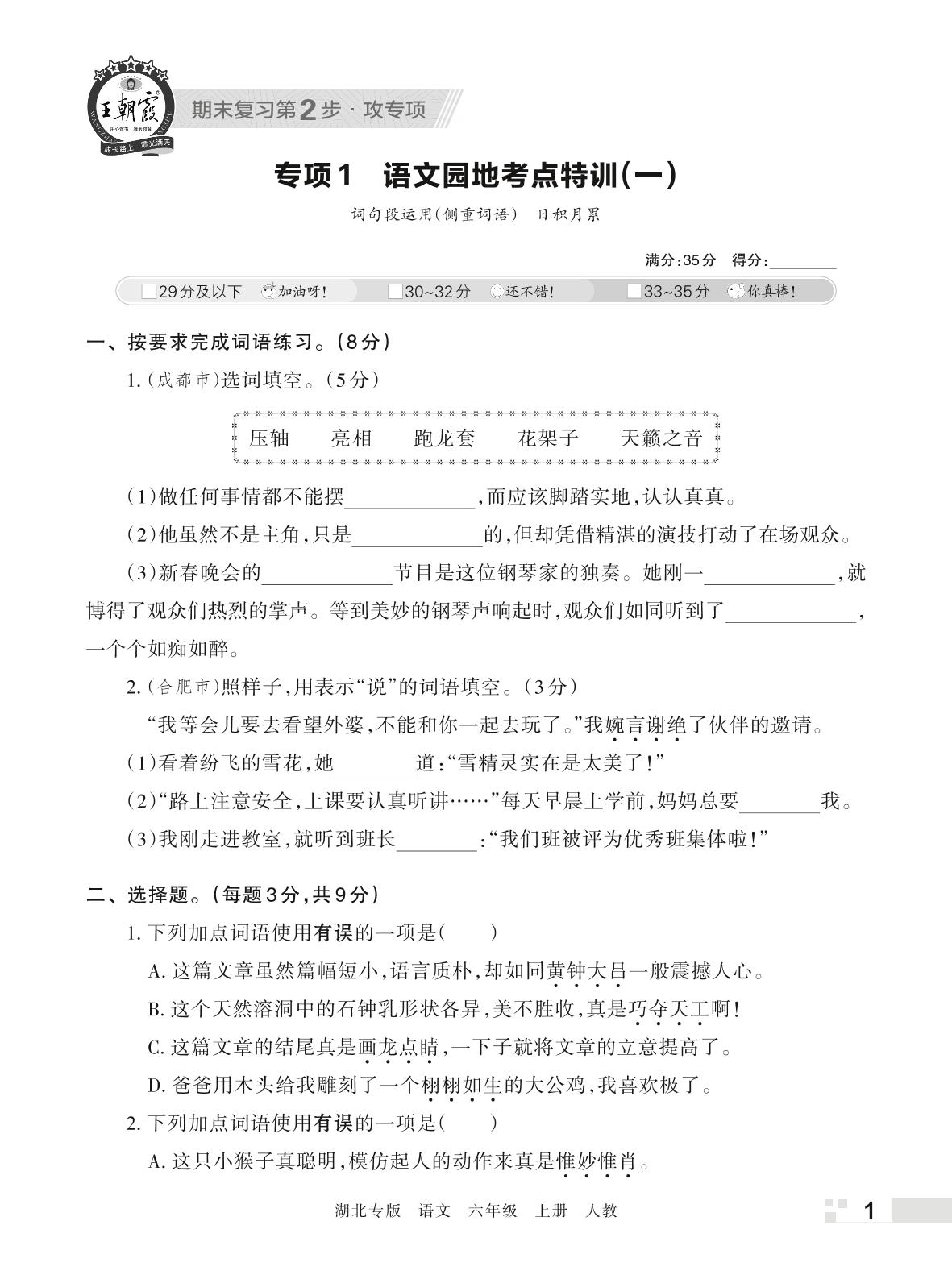 王朝霞期末专项卷——语文园地考点特训(一)六年级上册语文(人教版)_R221125170334822【1】