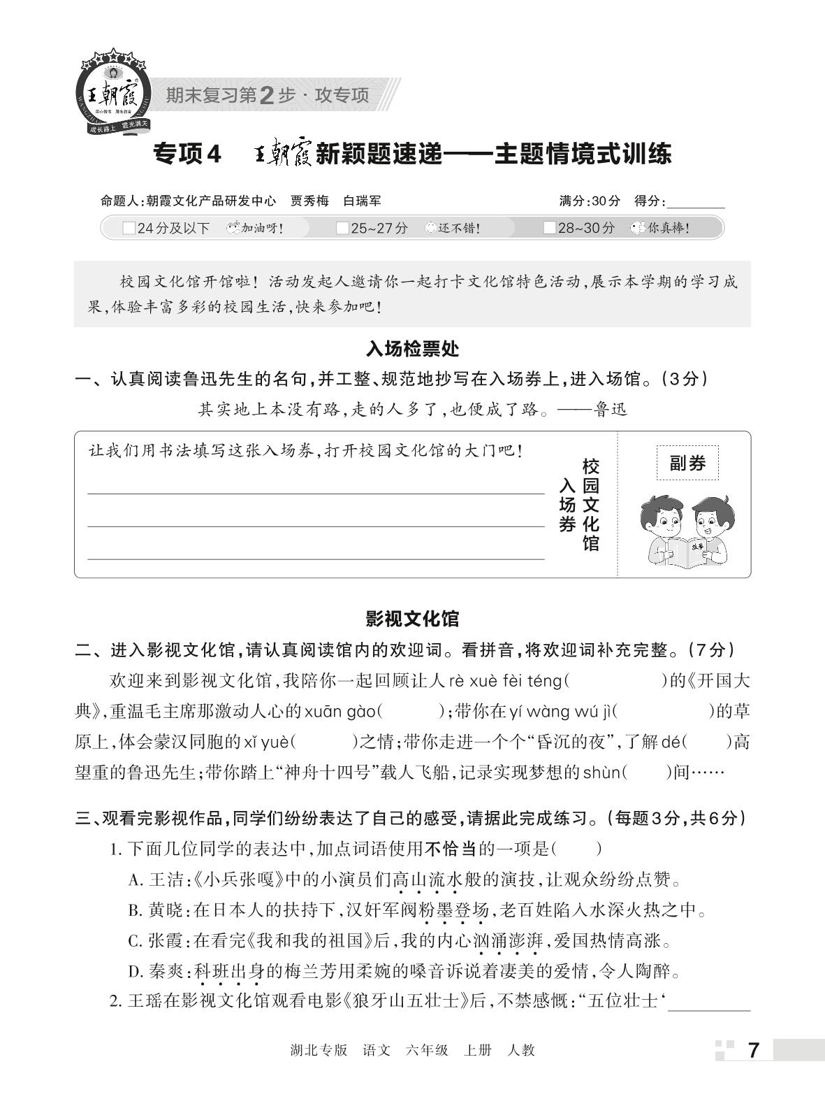 王朝霞期末专项卷——王朝霞新颖题速递:主题情境式训练六年级上册语文(人教版)_R221125170335396【4】