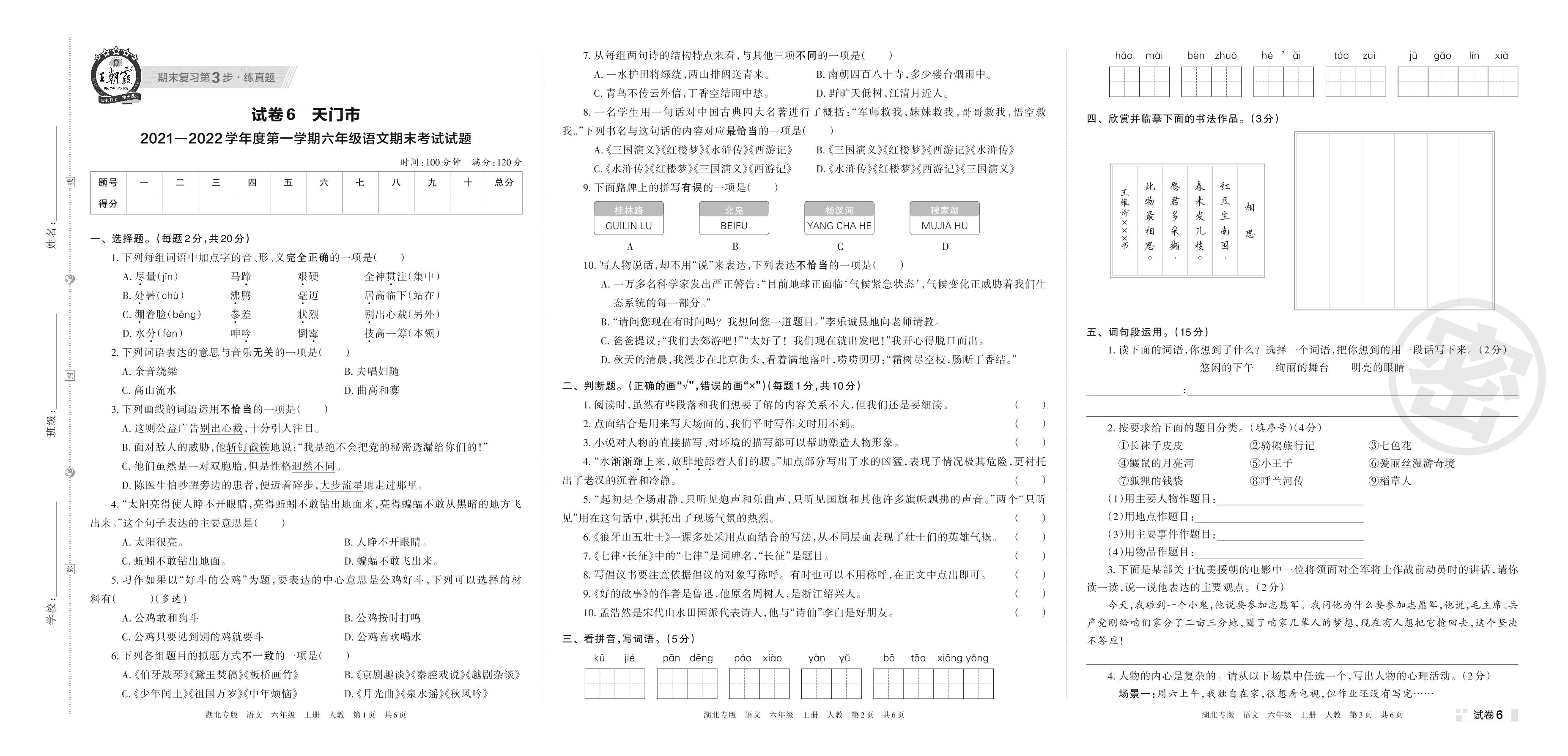天门市2021—2022学年度第一学期六年级语文期末考试试题(人教版)【6】