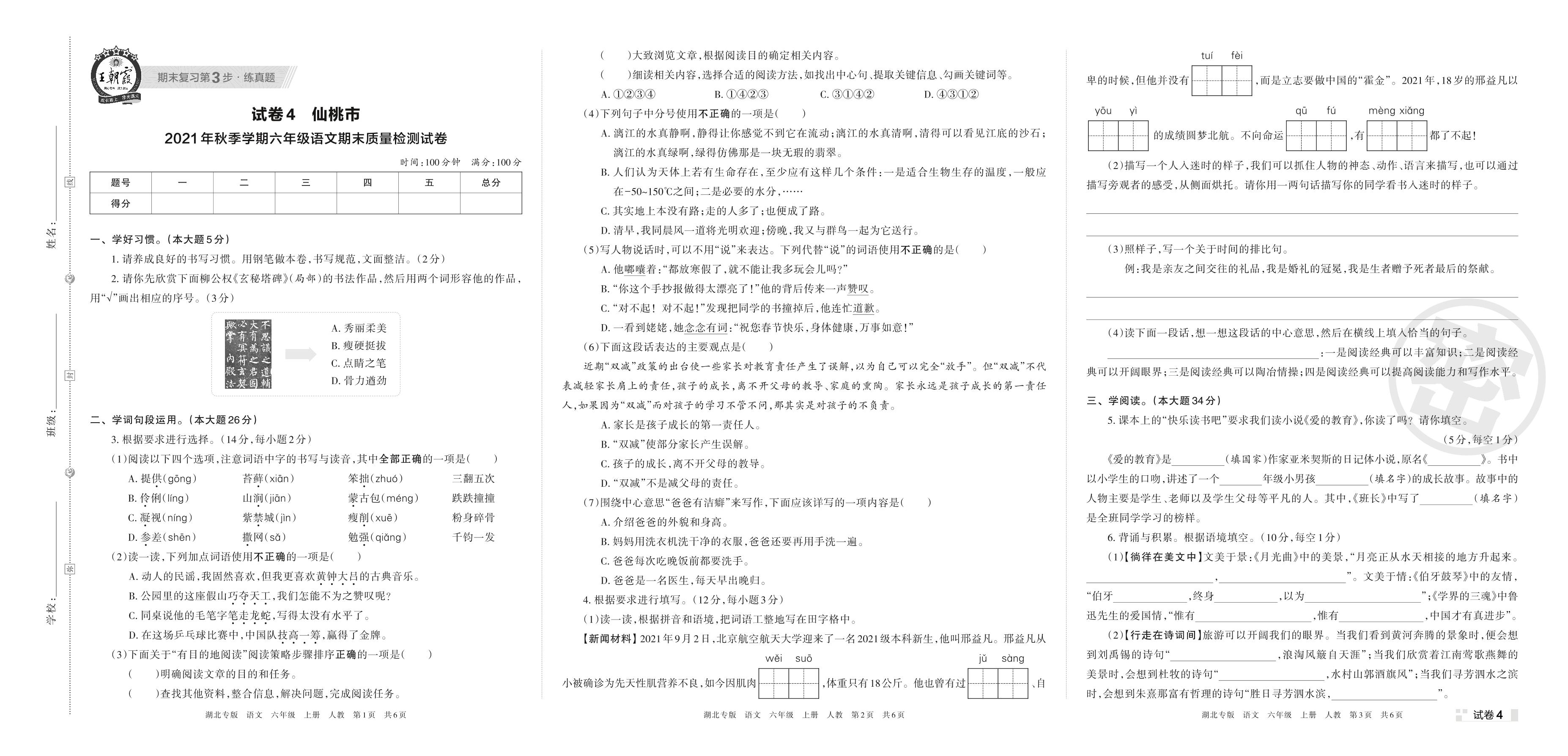 仙桃市2021年秋季学期六年级语文期末质量检测试卷(人教版)【4】