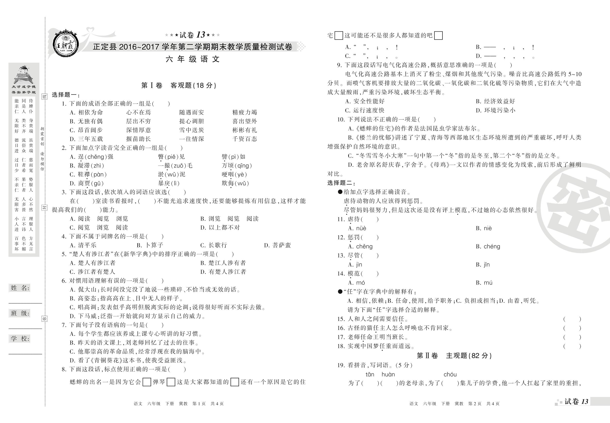 2016-2017学年第二学期石家庄市正定县六年级语文试卷(冀教版)【13】