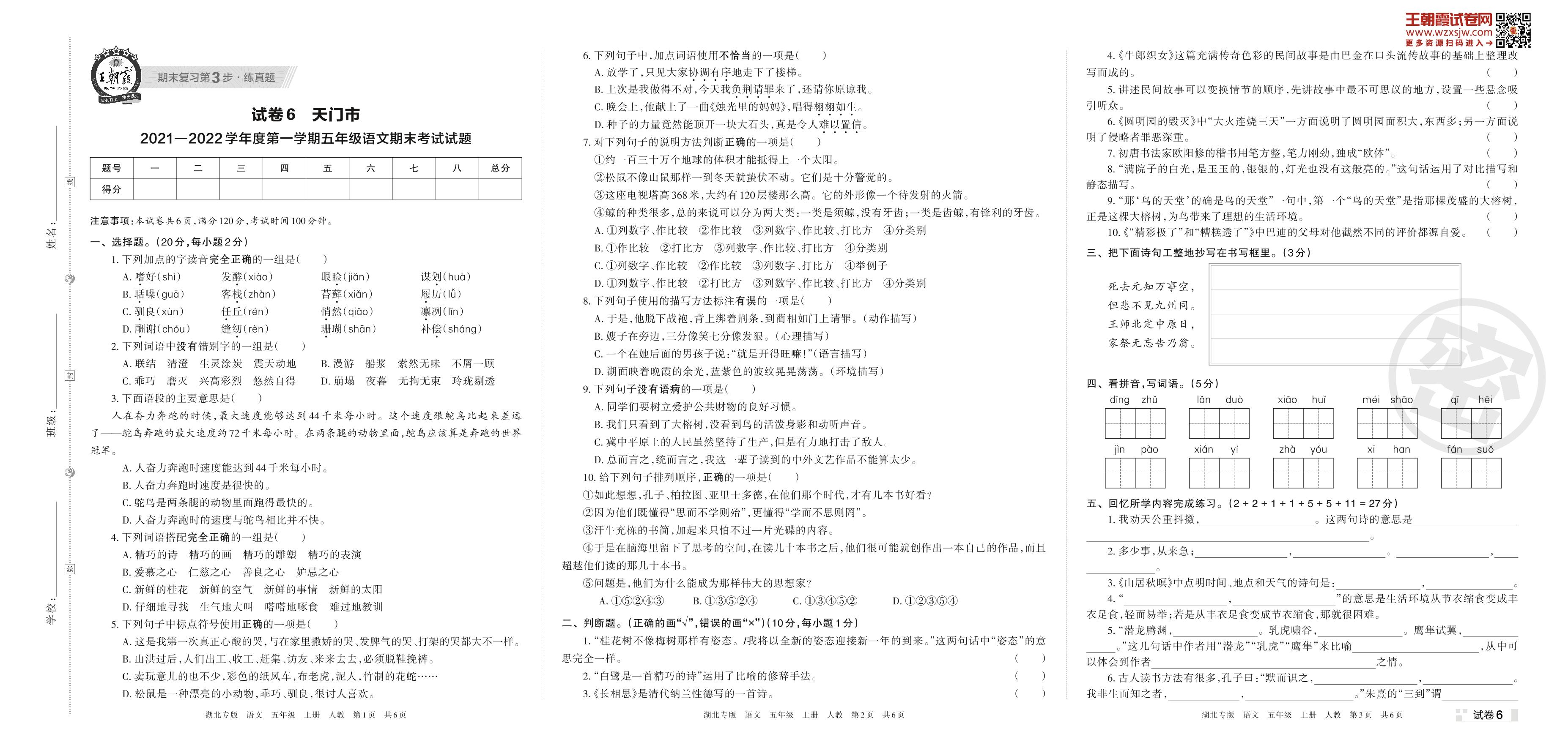 天门市2021—2022学年度第一学期五年级语文期末考试试题(人教版)【6】