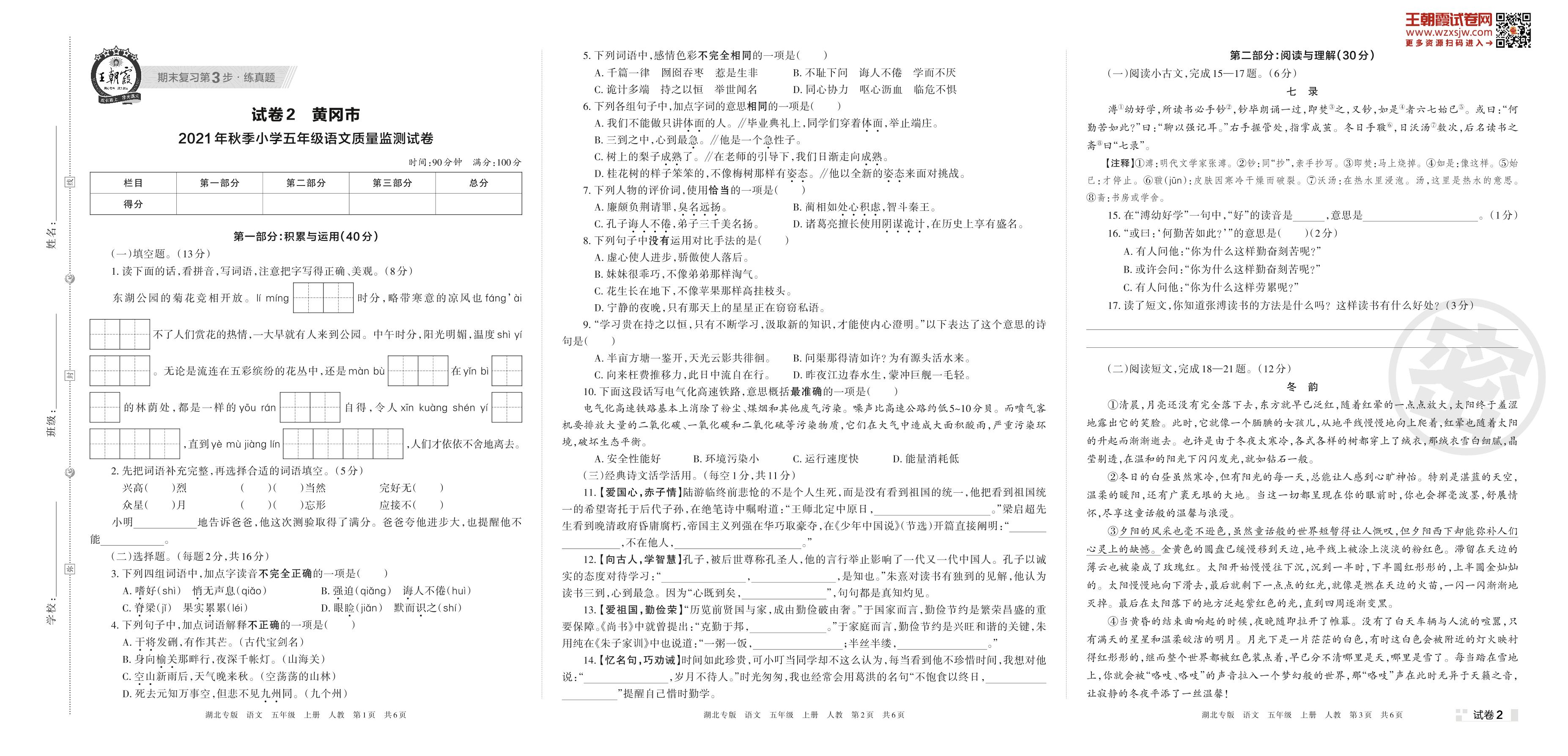 黄冈市2021年秋季小学五年级语文质量监测试卷(人教版)【2】