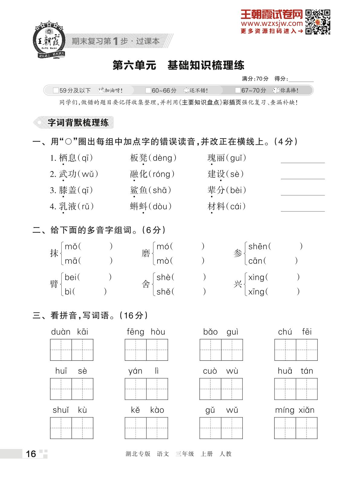 王朝霞期末过课本——第六单元 基础知识梳理练三年级上册语文(人教版)_R221125172203864
