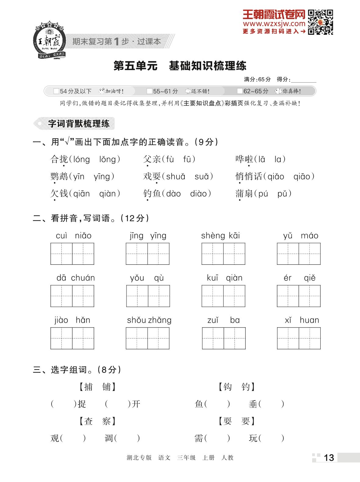 王朝霞期末过课本——第五单元 基础知识梳理练三年级上册语文(人教版)_R221125172203774