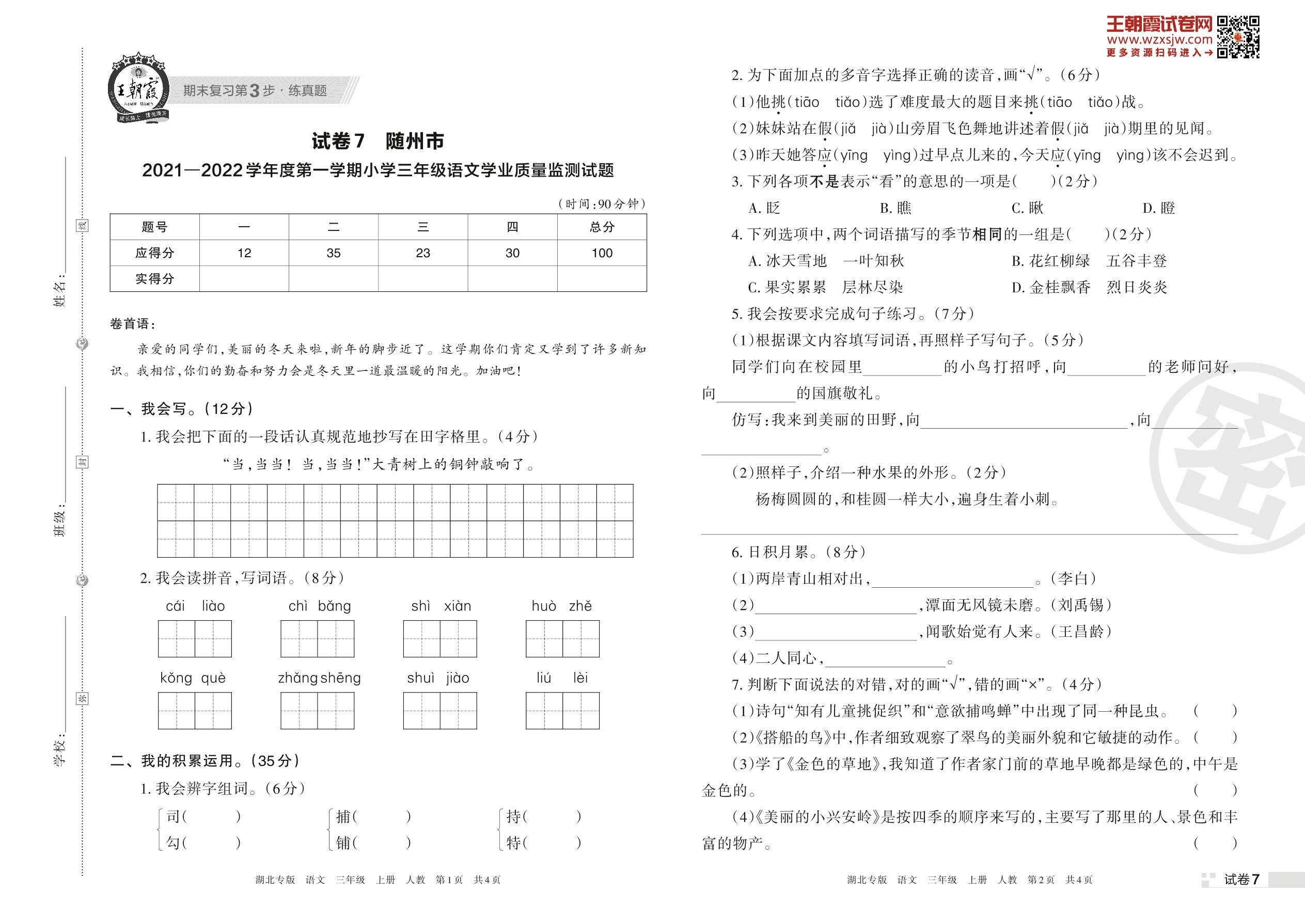 随州市2021—2022学年度第一学期小学三年级语文学业质量监测试题(人教版)【7】