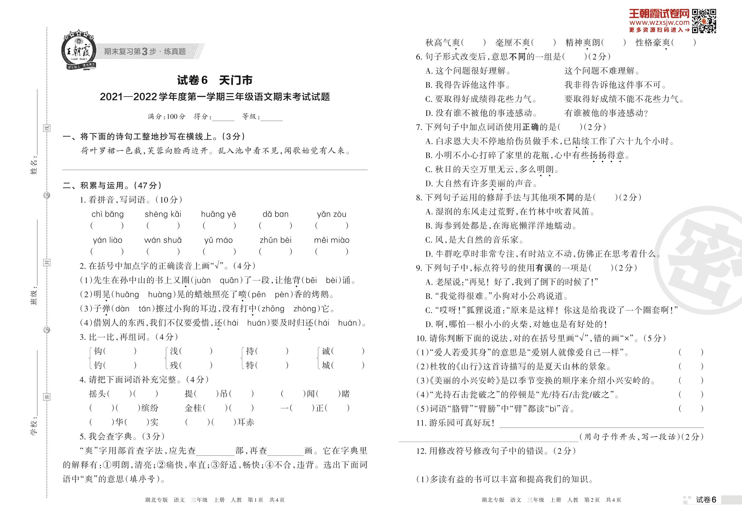 天门市2021—2022学年度第一学期三年级语文期末考试试题(人教版)【6】