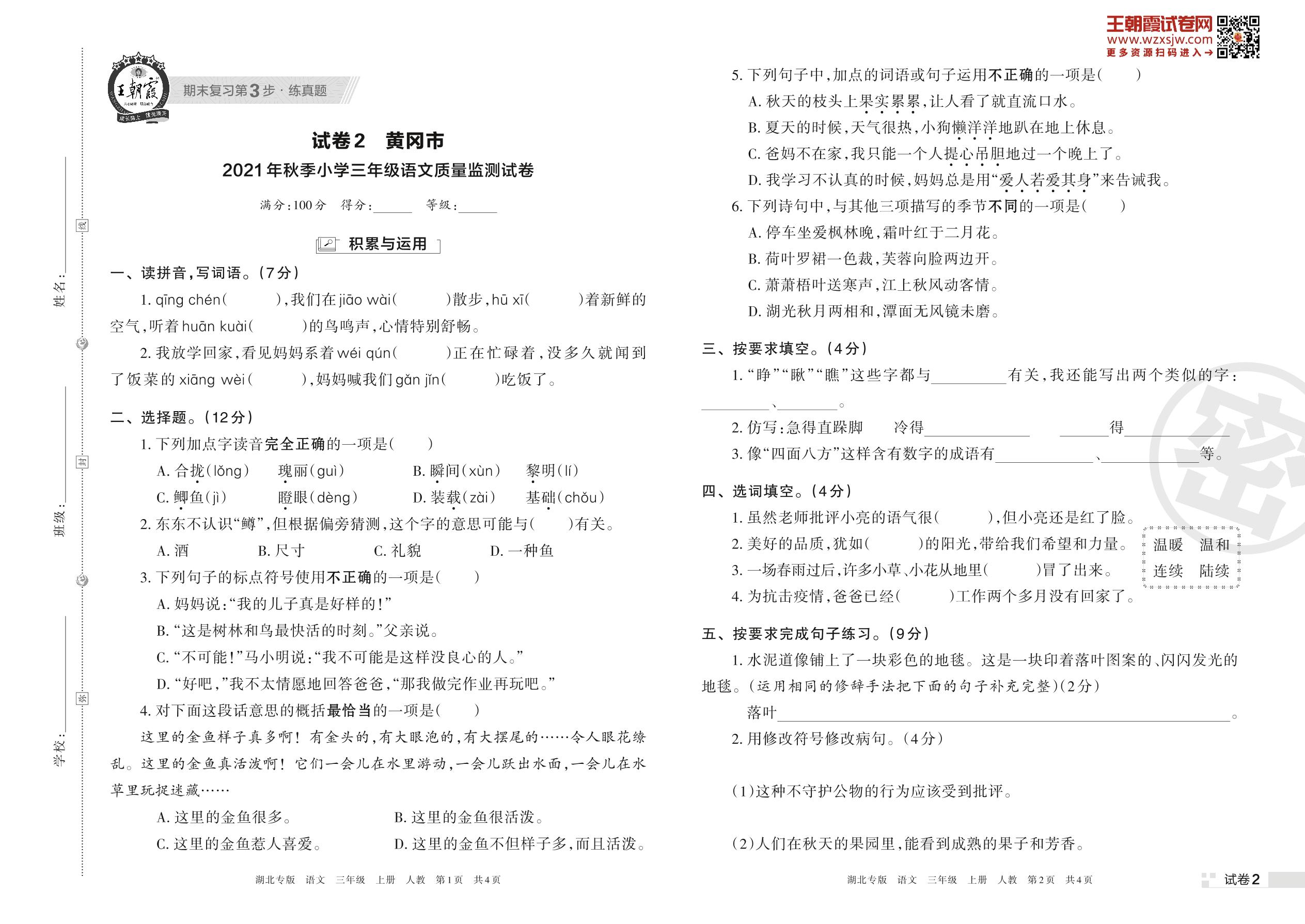 黄冈市2021年秋季小学三年级语文质量监测试卷(人教版)【2】