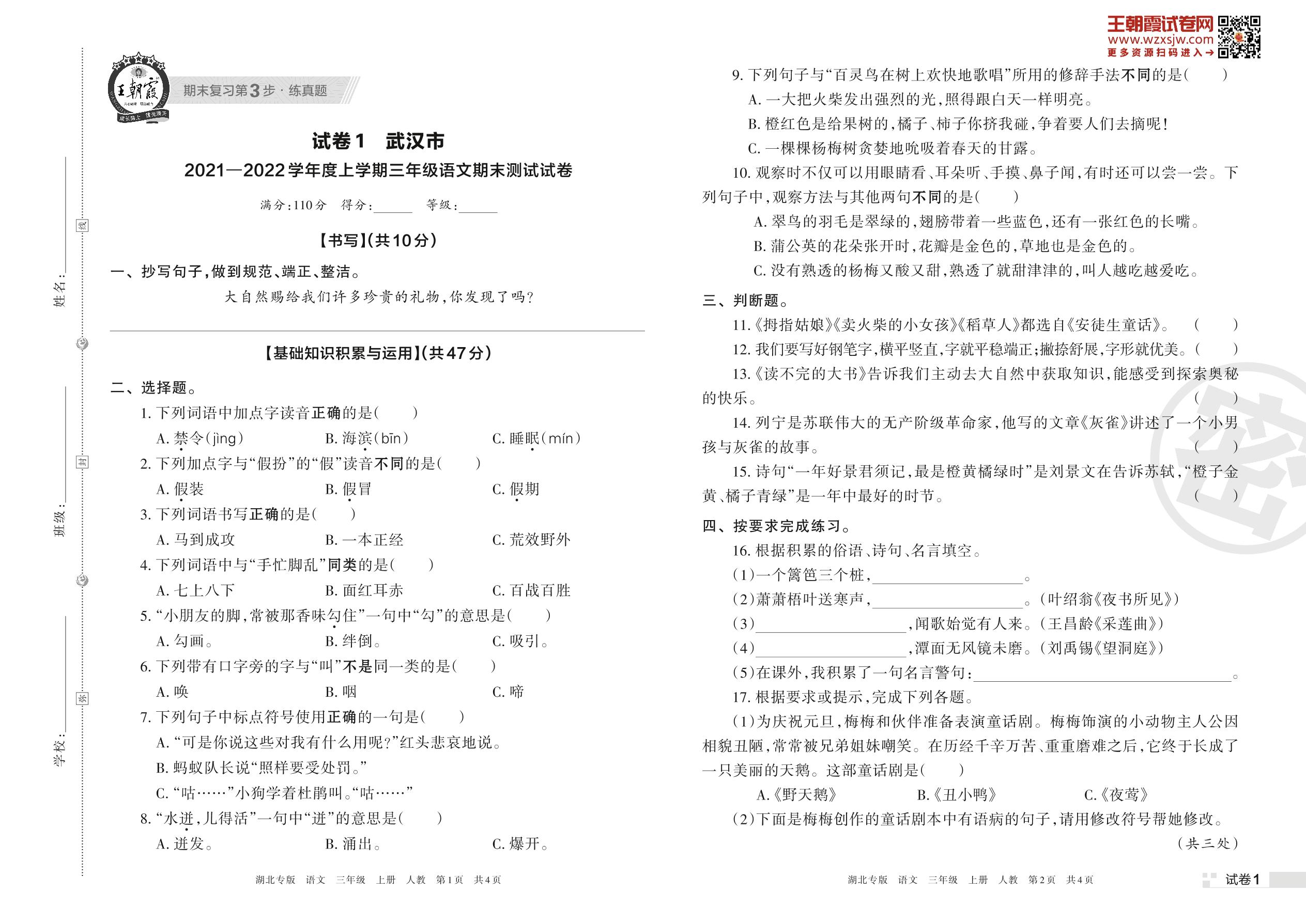 武汉市2021—2022学年度上学期三年级语文期末测试试卷(人教版)【1】