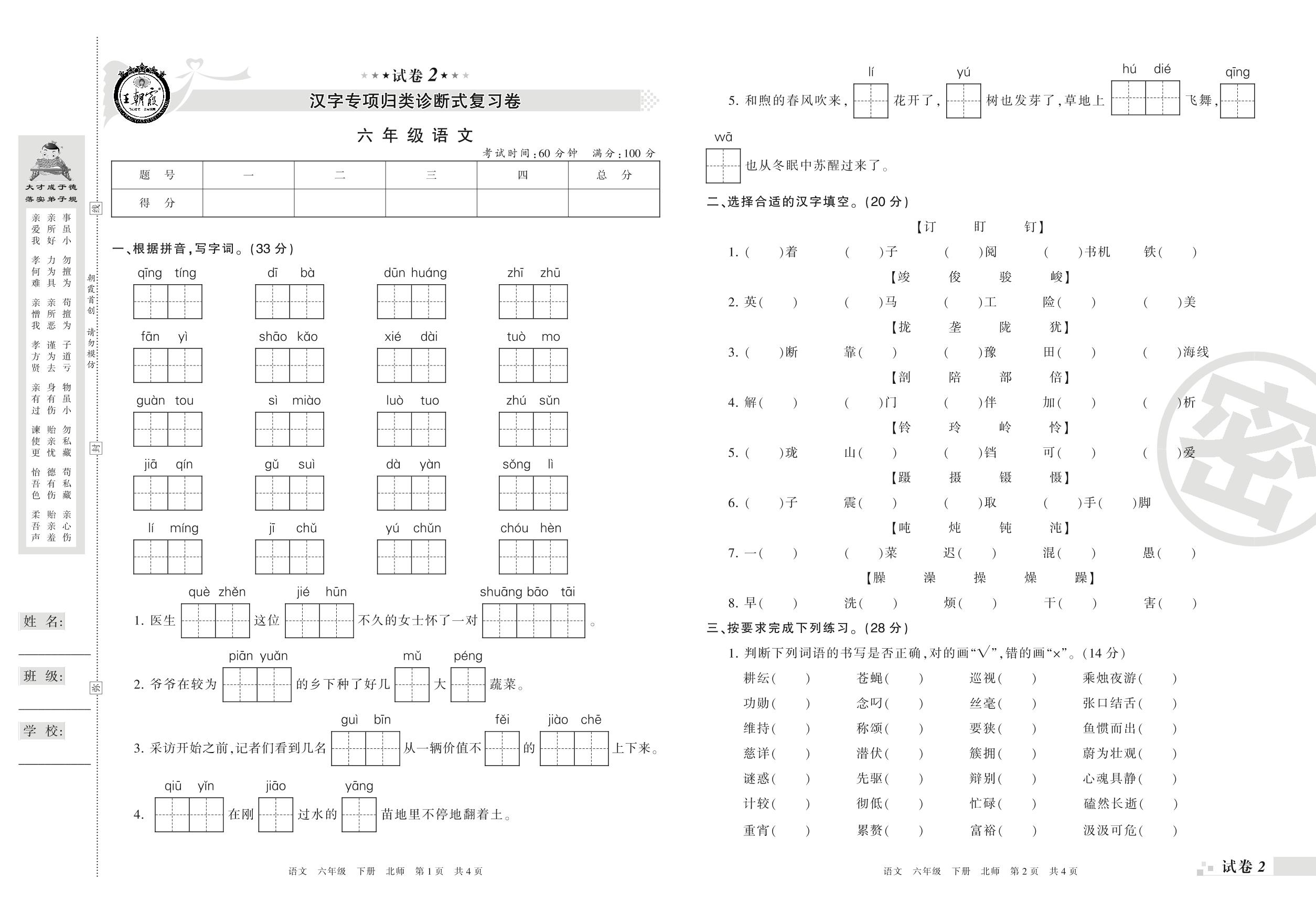 王朝霞期末专项卷——汉字专项归类诊断式复习卷六年级下册语文(北师版)_R210802120852【2】