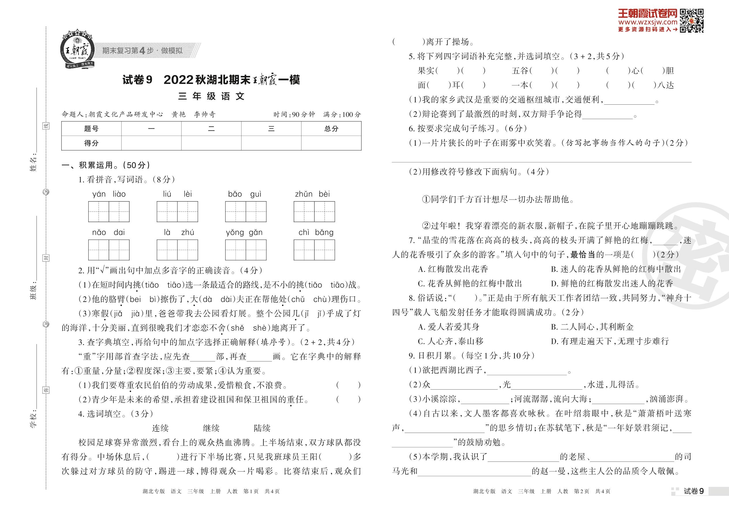 王朝霞期末模拟卷三年级上册语文(人教版)_R221125172206720【9】
