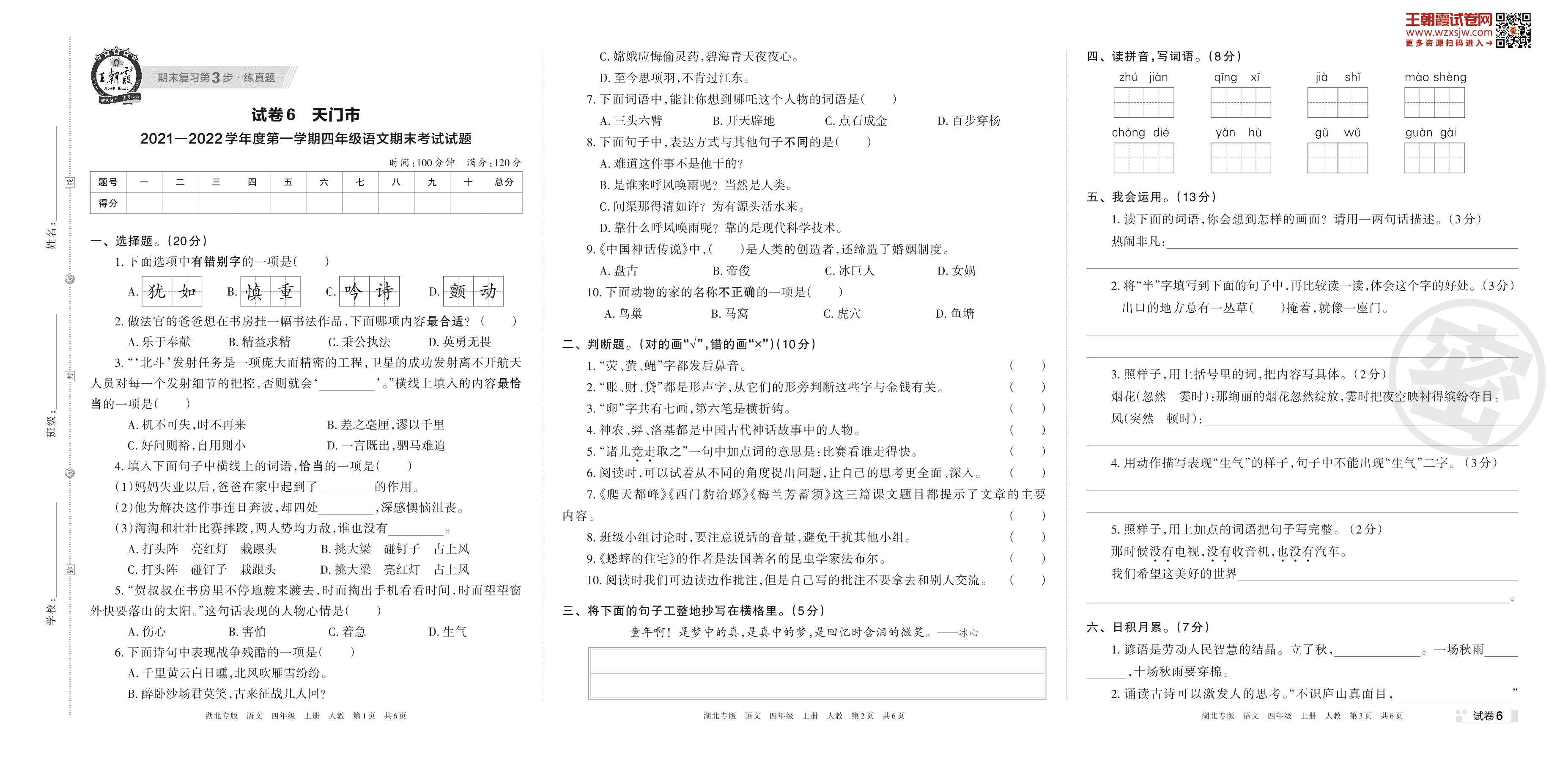 天门市2021—2022学年度第一学期四年级语文期末考试试题(人教版)【6】