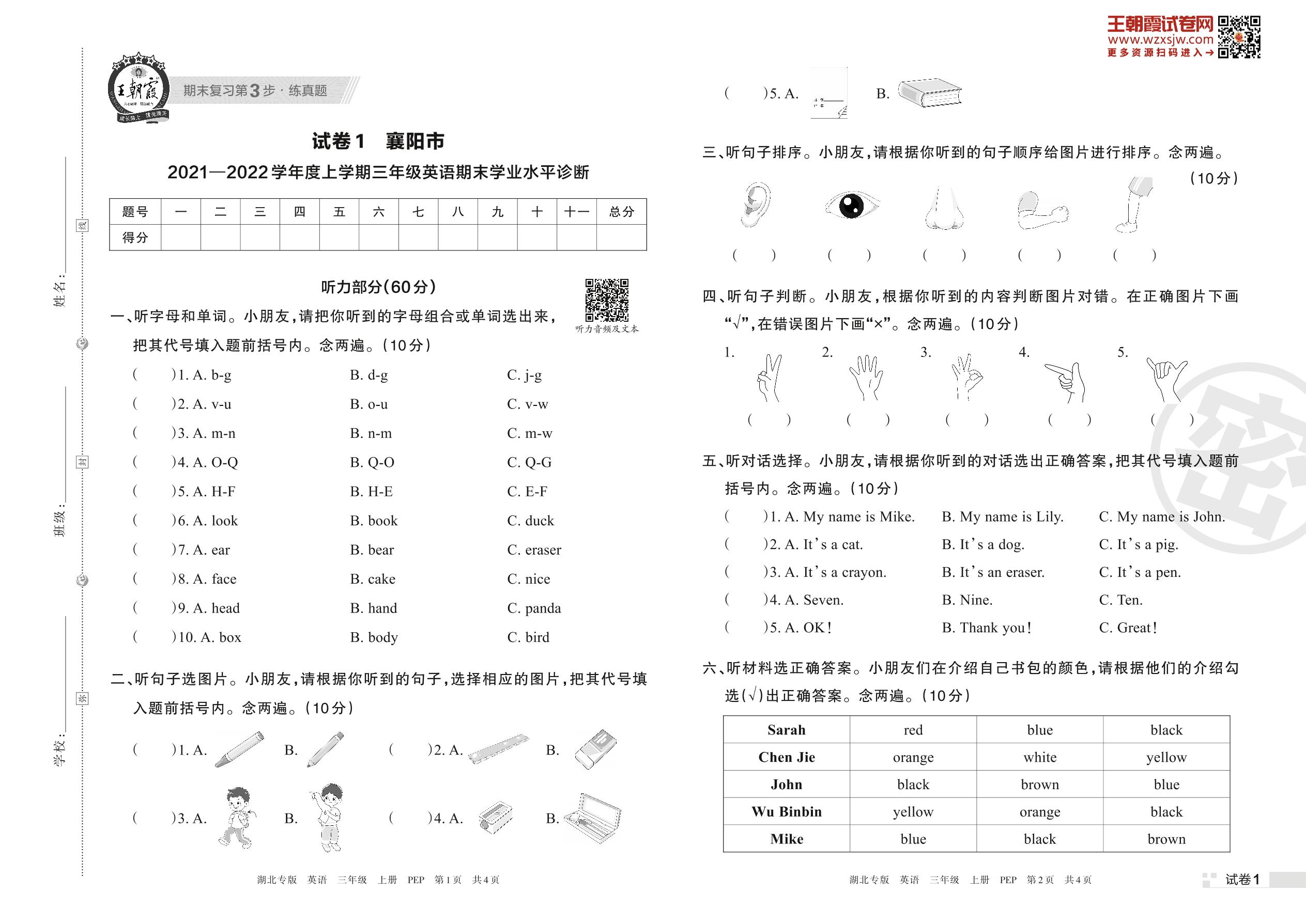 襄阳市2021—2022学年度上学期三年级英语期末学业水平诊断(PEP版)【1】