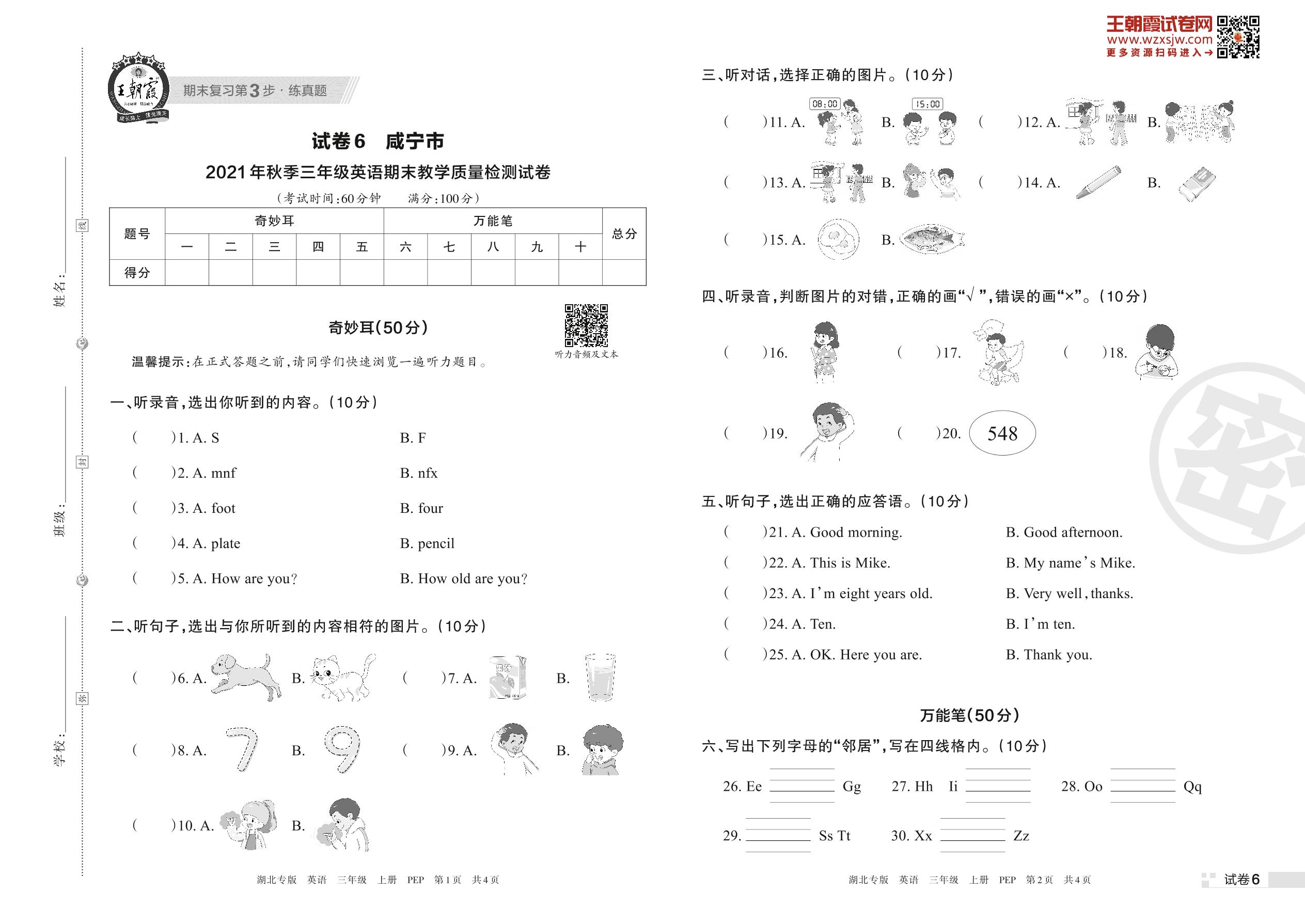 咸宁市2021年秋季三年级英语期末教学质量检测试卷(PEP版)【6】